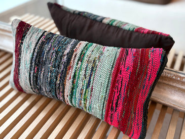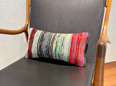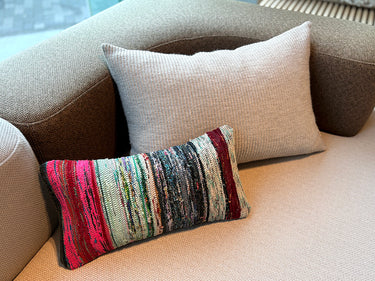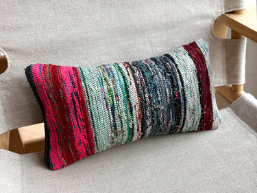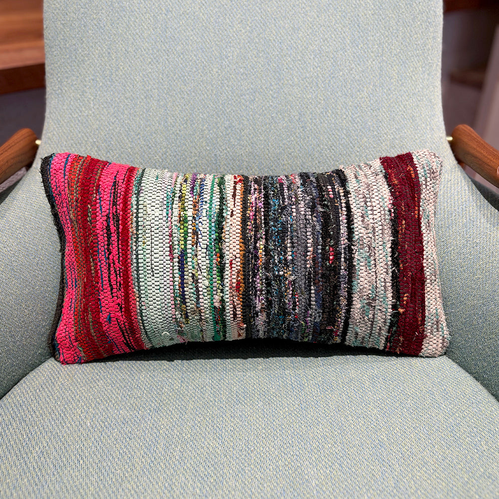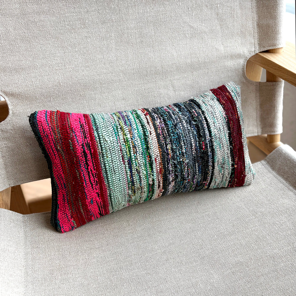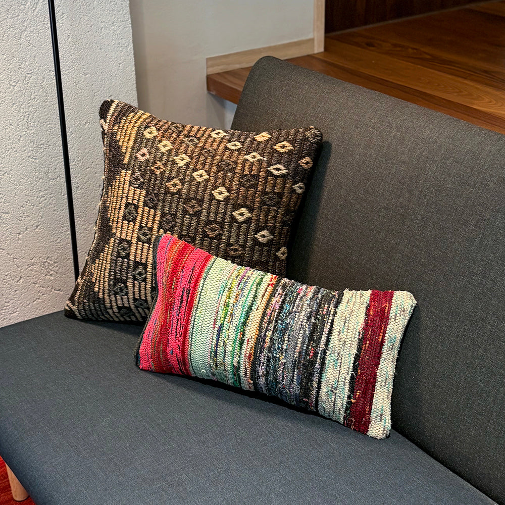 この Kilim Cushion(キリムクッション)は、ROGOBA(ロゴバ)が Old Textile(オールドテキスタイル・裂き織り)を加工して作製した、腰当てにぴったりな大変めずらしいサイズのクッションカバーです。