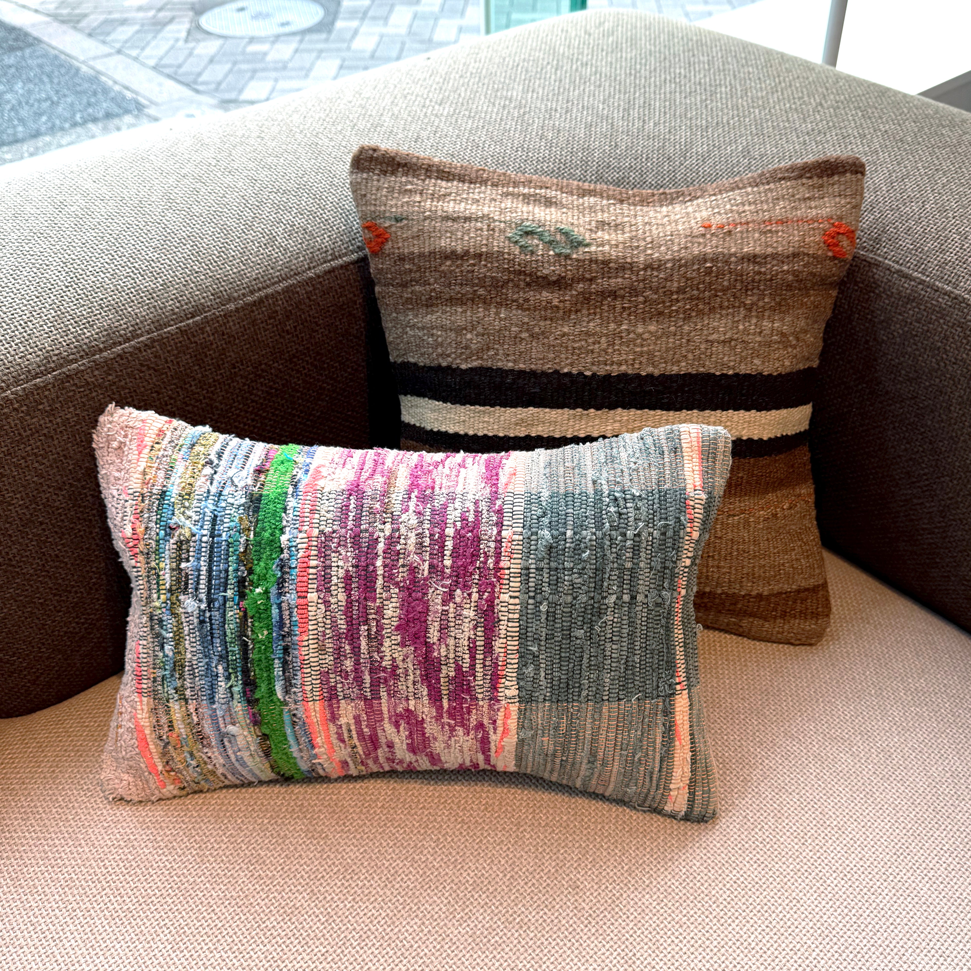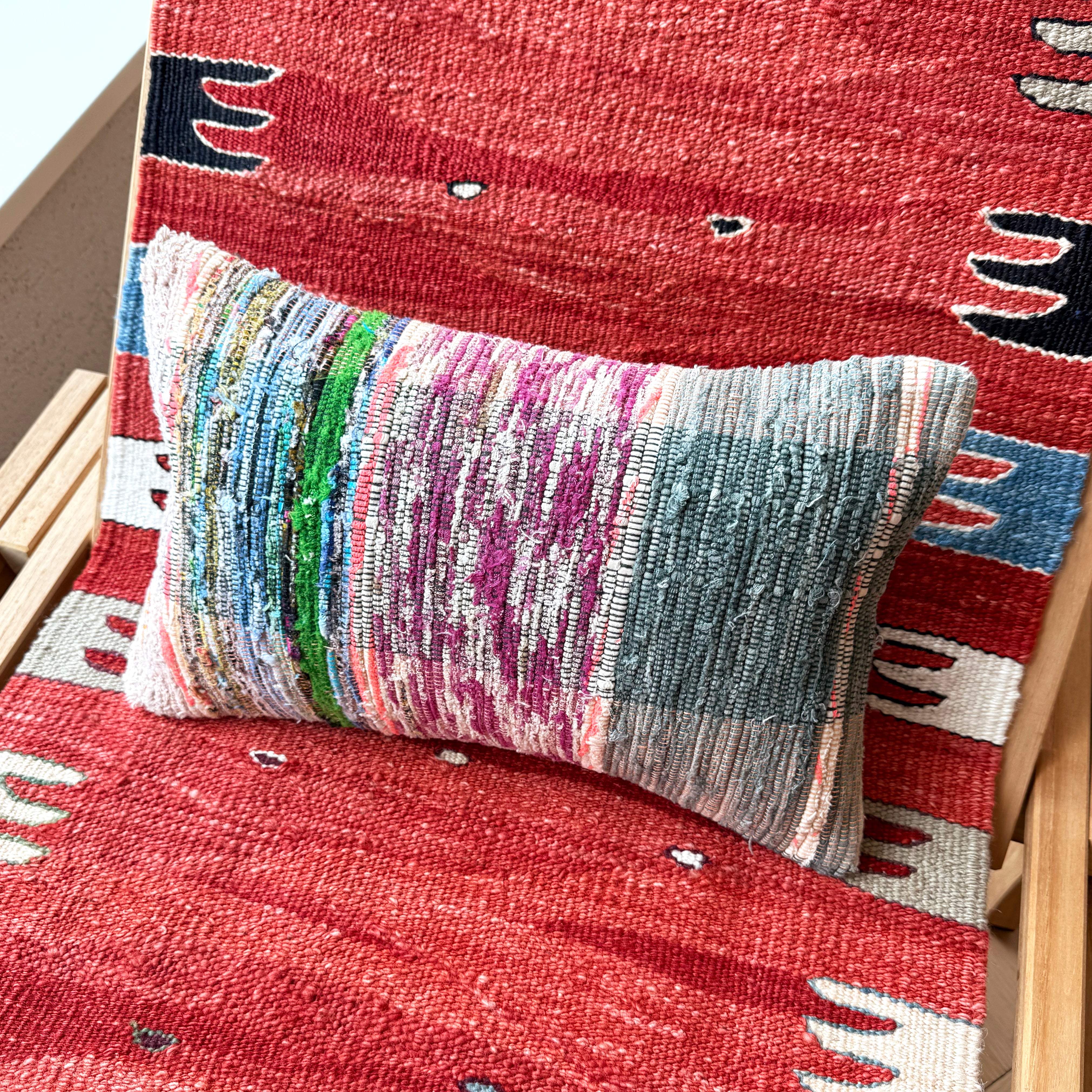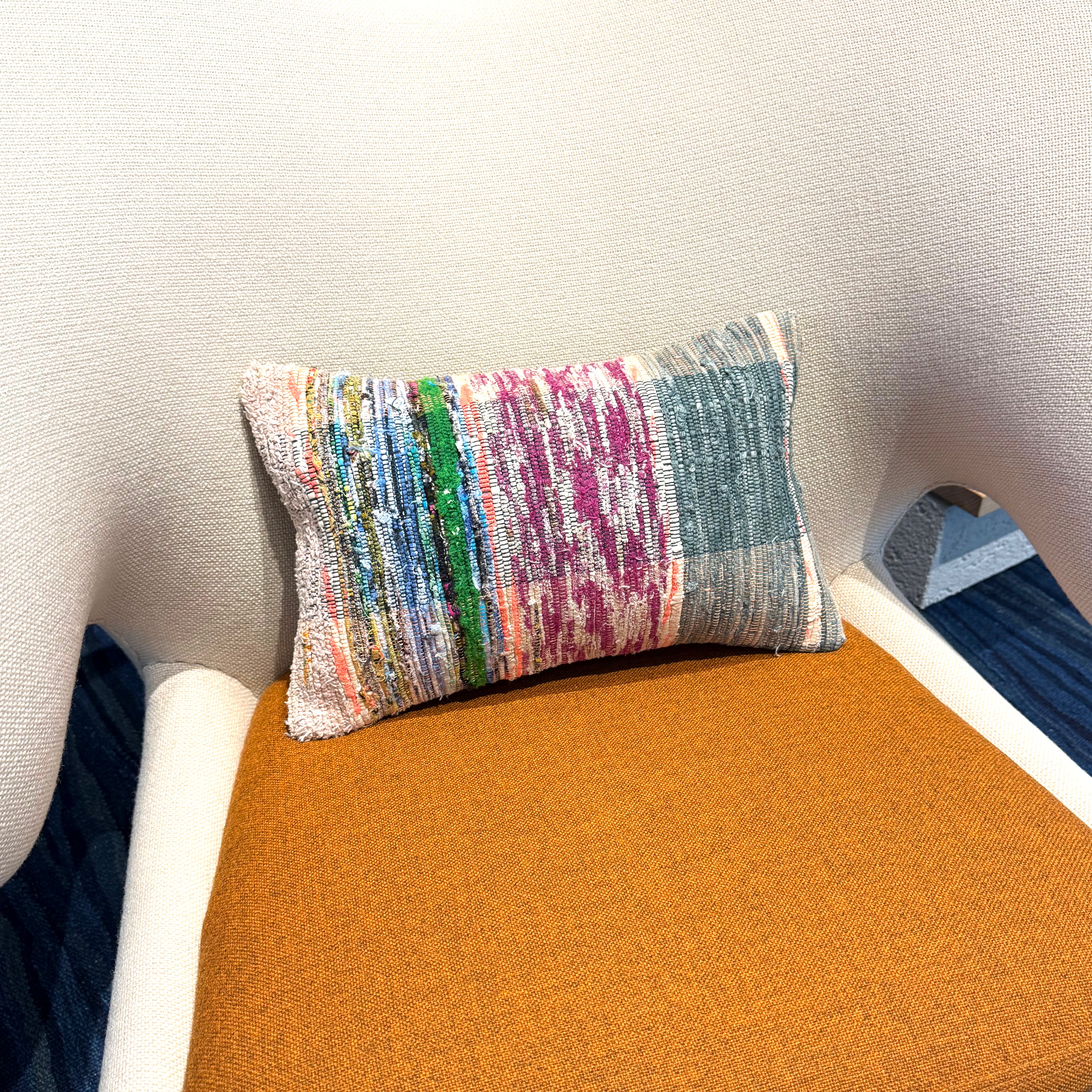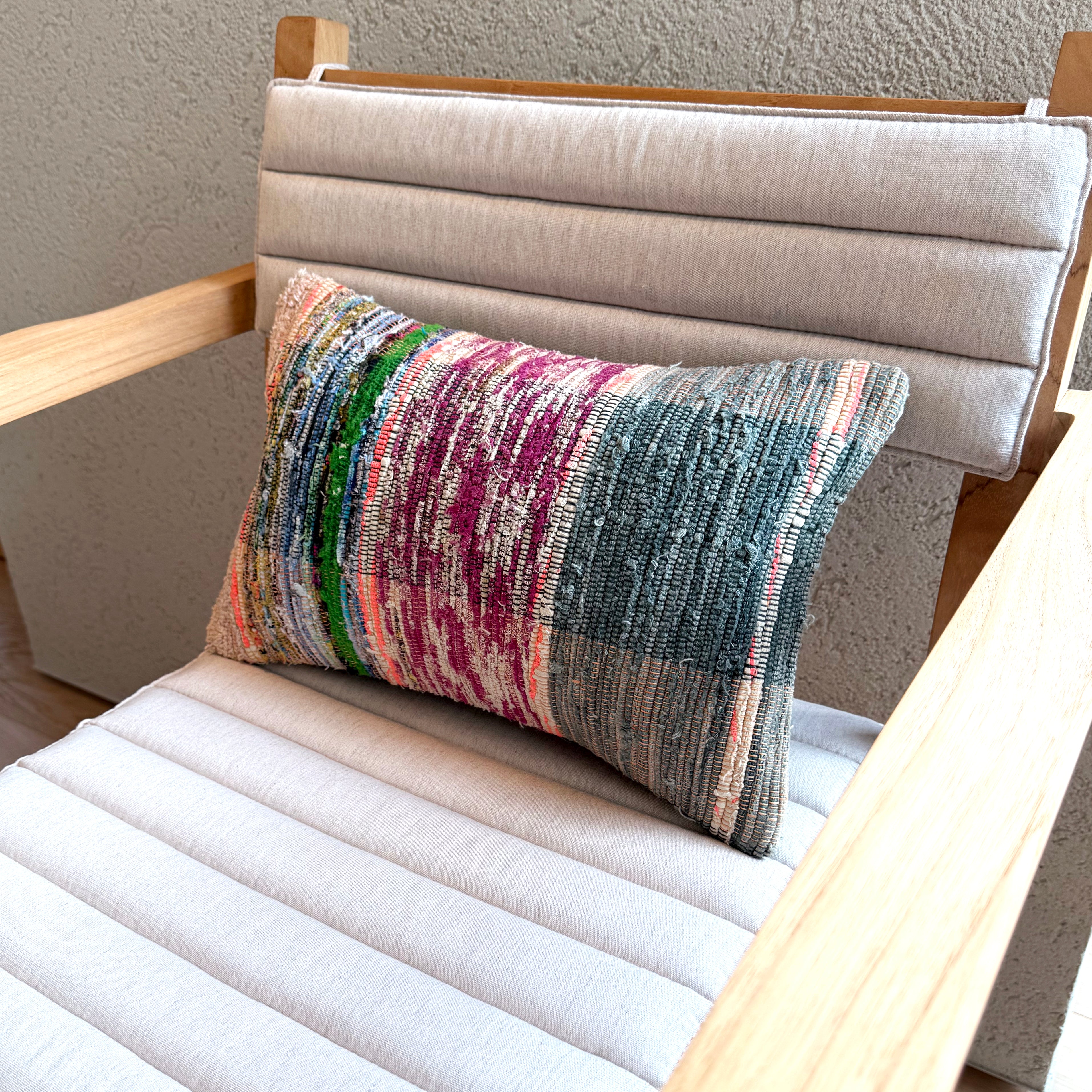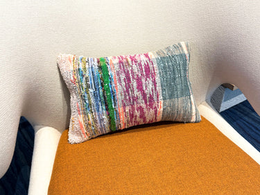この Kilim Cushion(キリムクッション)は、ROGOBA(ロゴバ)が Old Textile(オールドテキスタイル・裂き織り)を加工して作製した、腰当てにぴったりな大変めずらしいサイズのクッションカバーです。