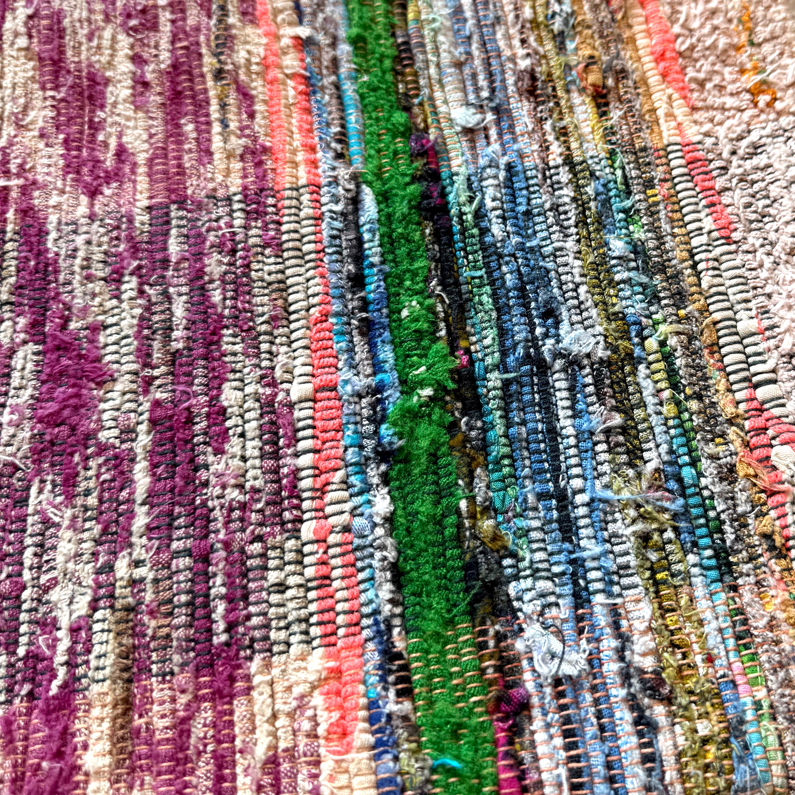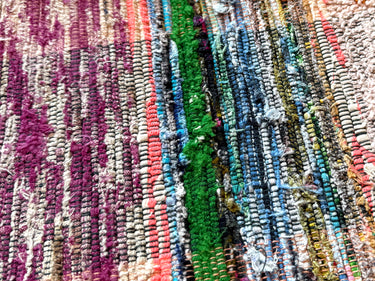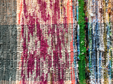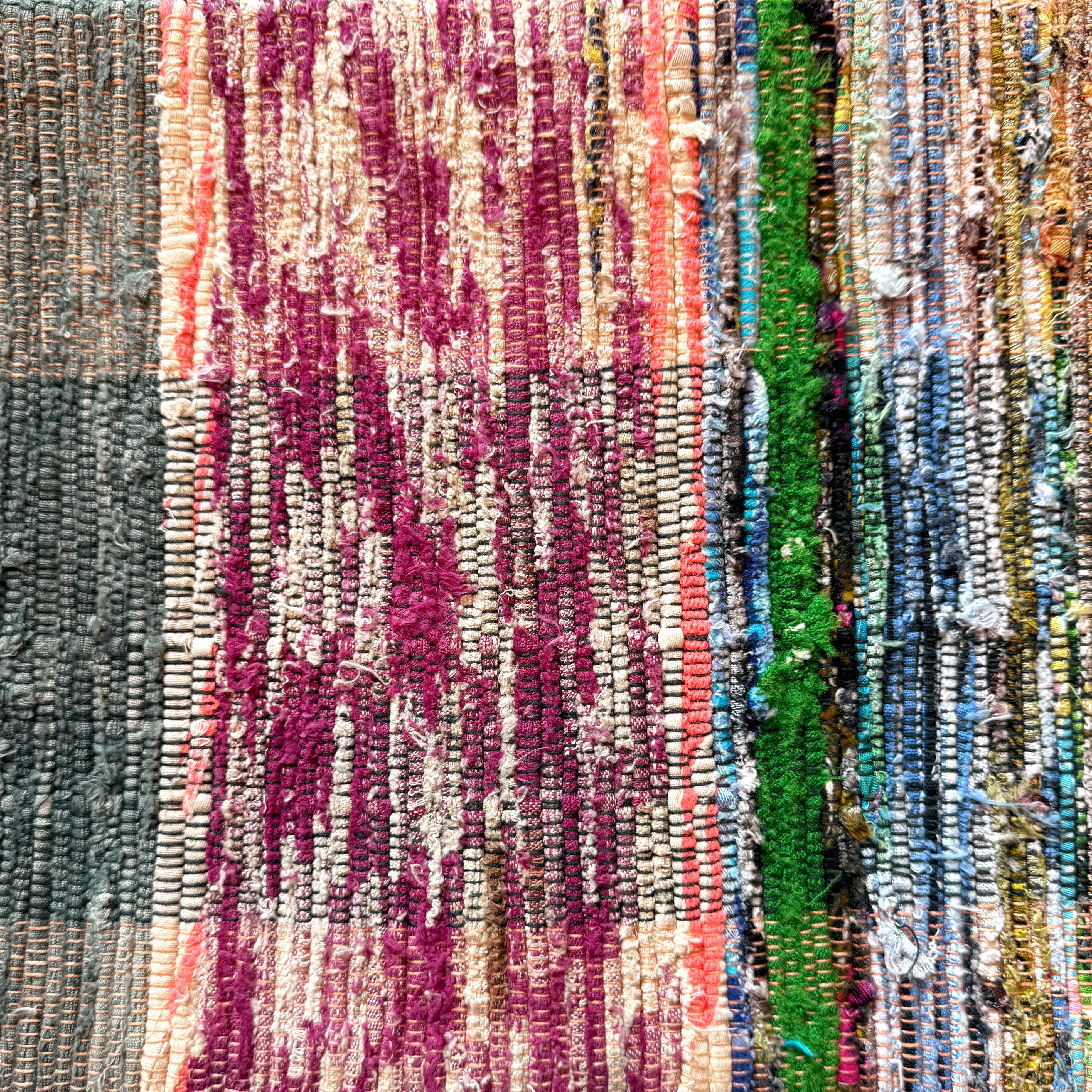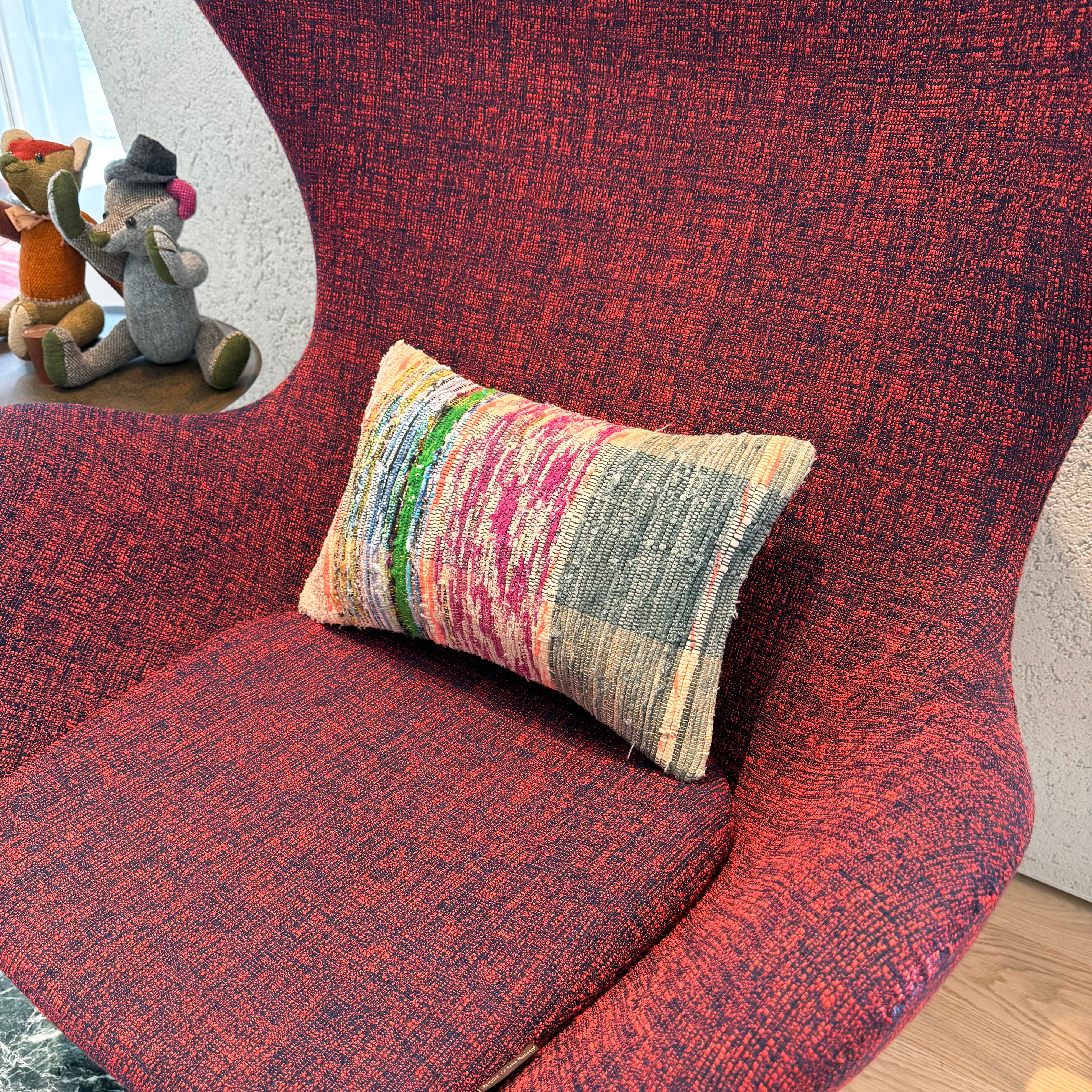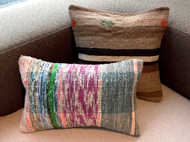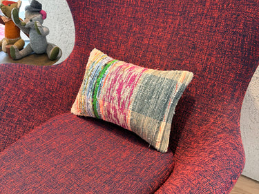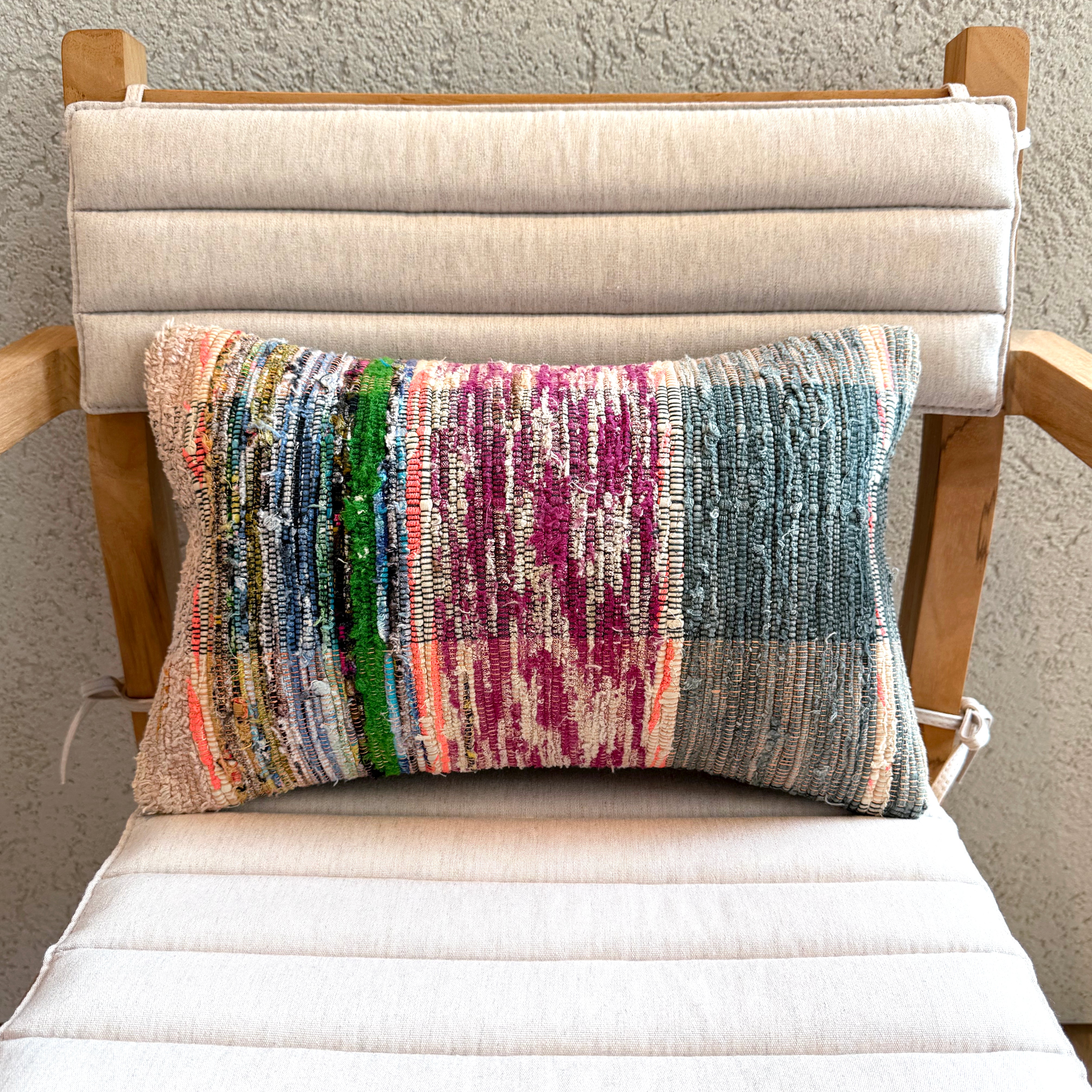 この Kilim Cushion(キリムクッション)は、ROGOBA(ロゴバ)が Old Textile(オールドテキスタイル・裂き織り)を加工して作製した、腰当てにぴったりな大変めずらしいサイズのクッションカバーです。