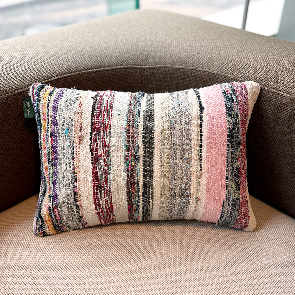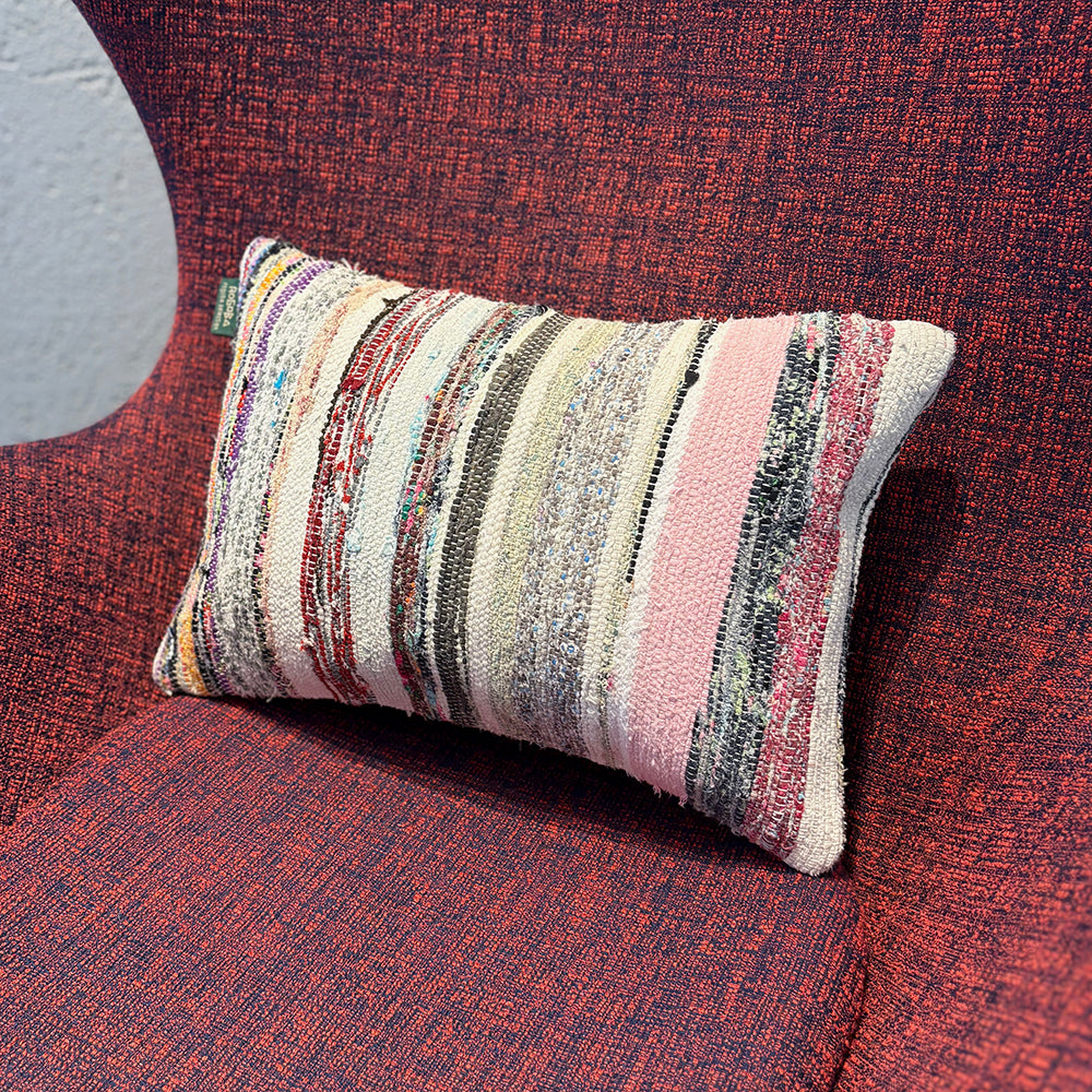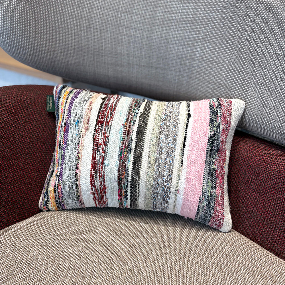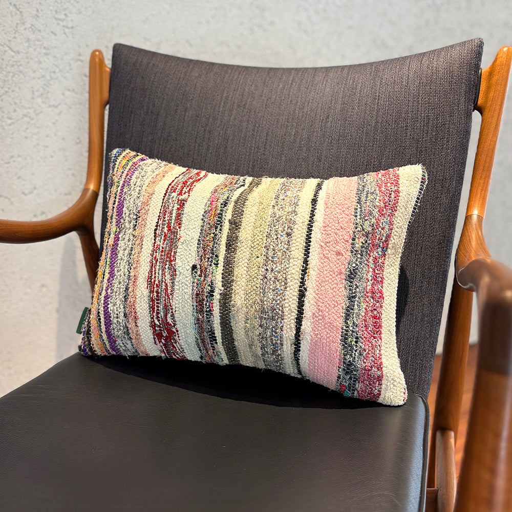 この Kilim Cushion(キリムクッション)は、ROGOBA(ロゴバ)が Old Textile(オールドテキスタイル・裂き織り)を加工して作製した、腰当てにぴったりな大変めずらしいサイズのクッションカバーです。