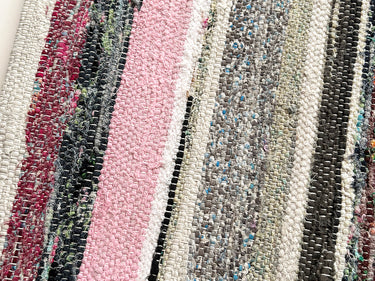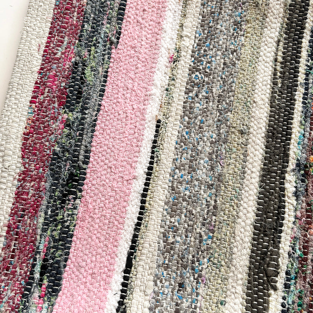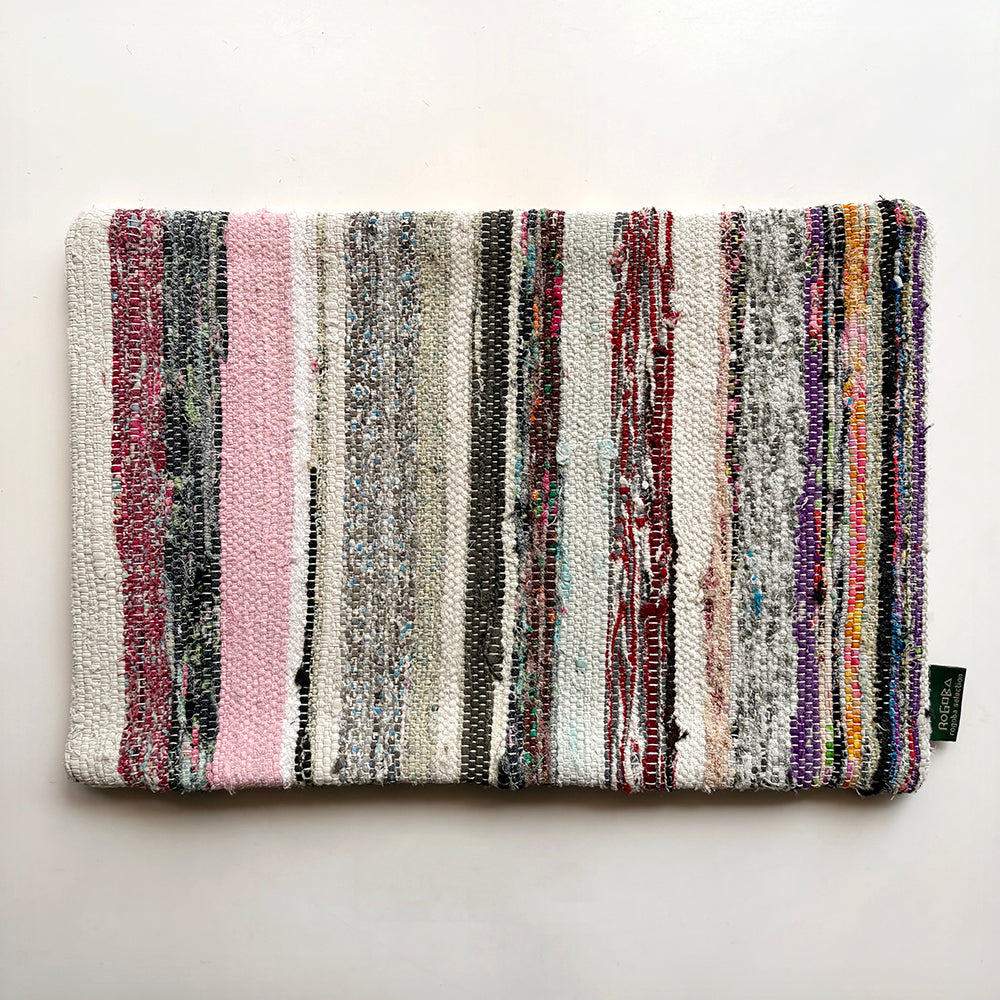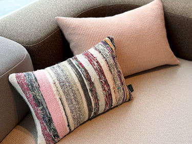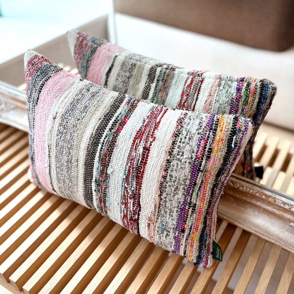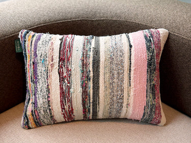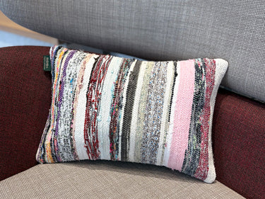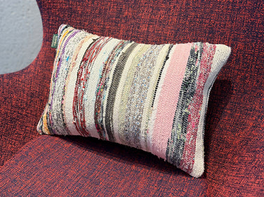 この Kilim Cushion(キリムクッション)は、ROGOBA(ロゴバ)が Old Textile(オールドテキスタイル・裂き織り)を加工して作製した、腰当てにぴったりな大変めずらしいサイズのクッションカバーです。