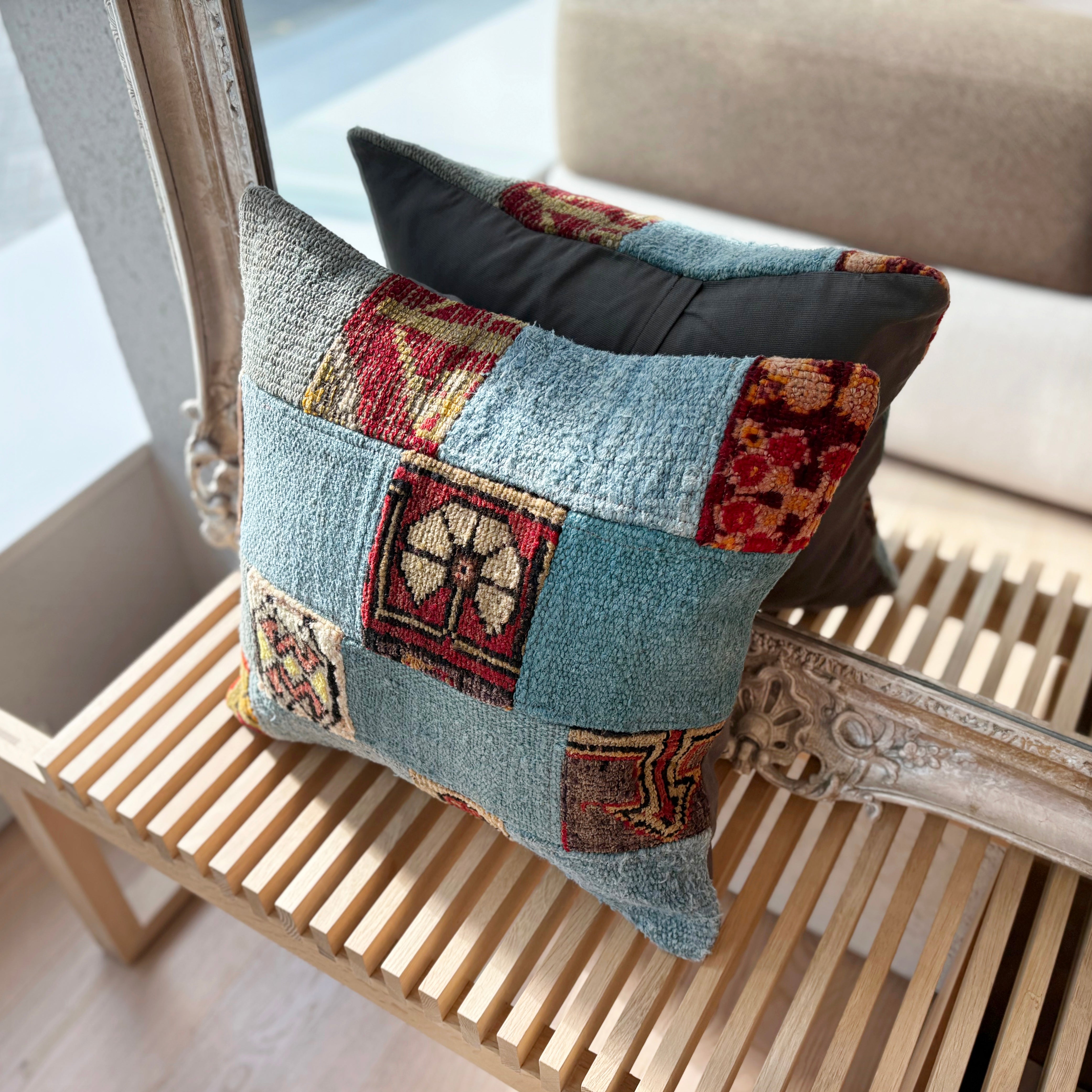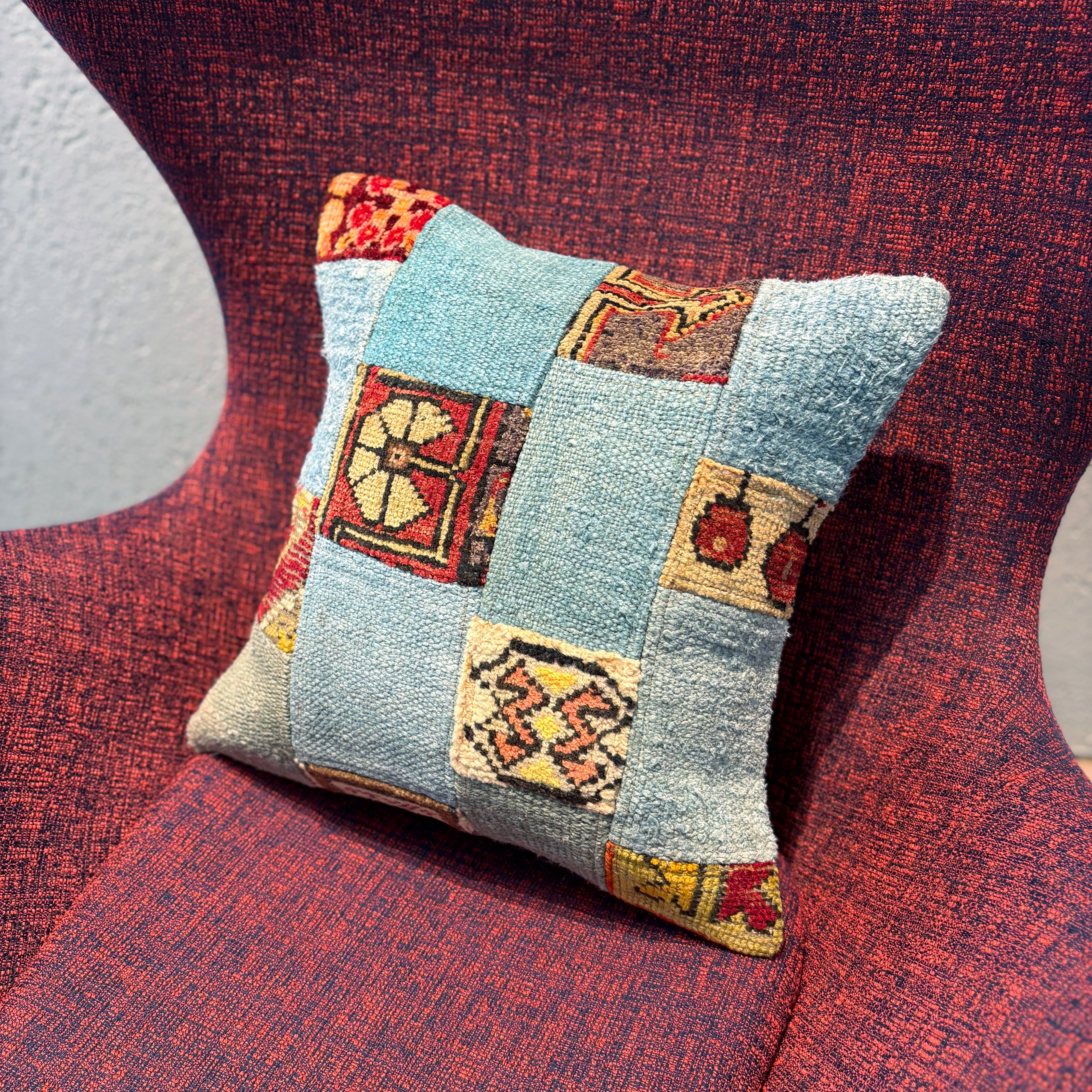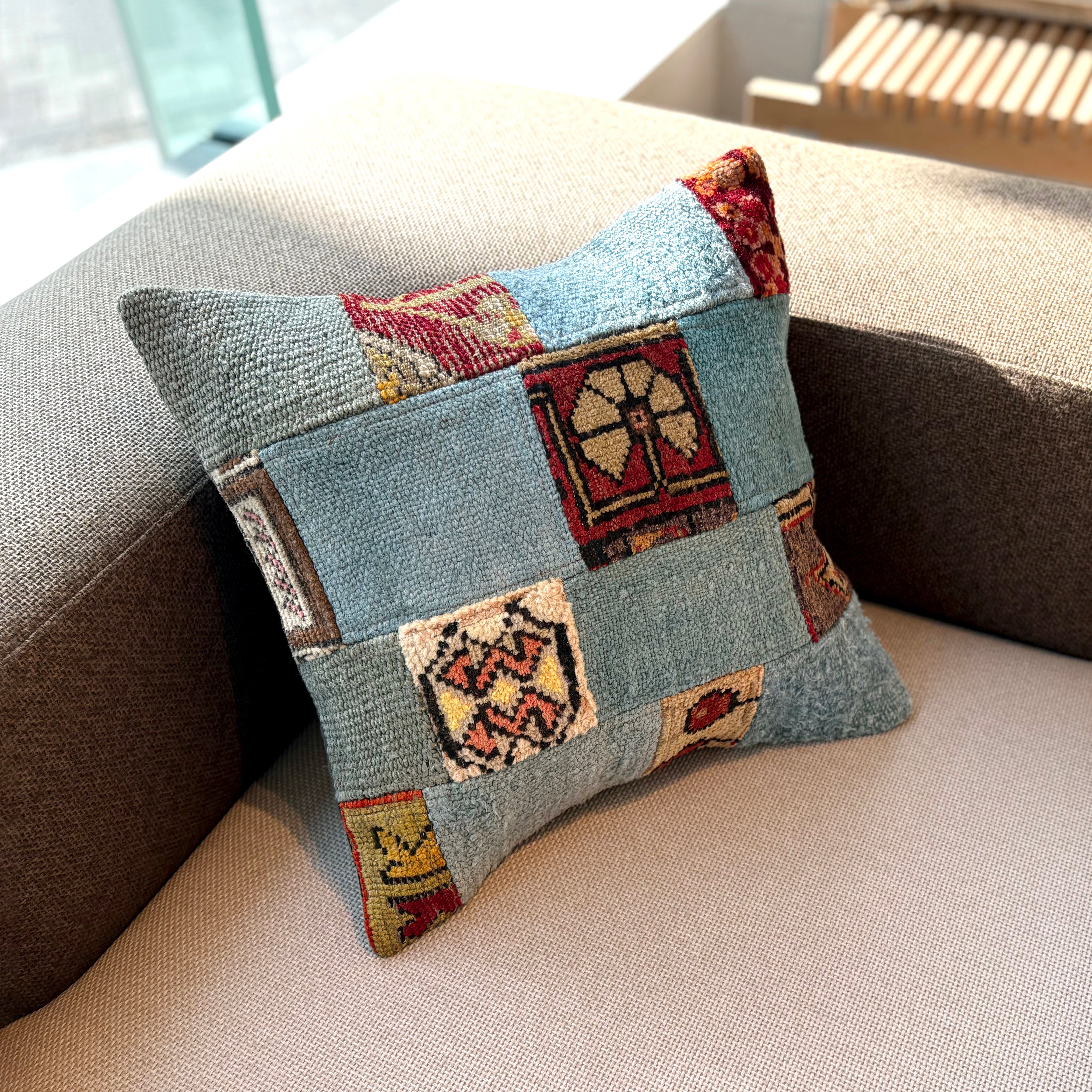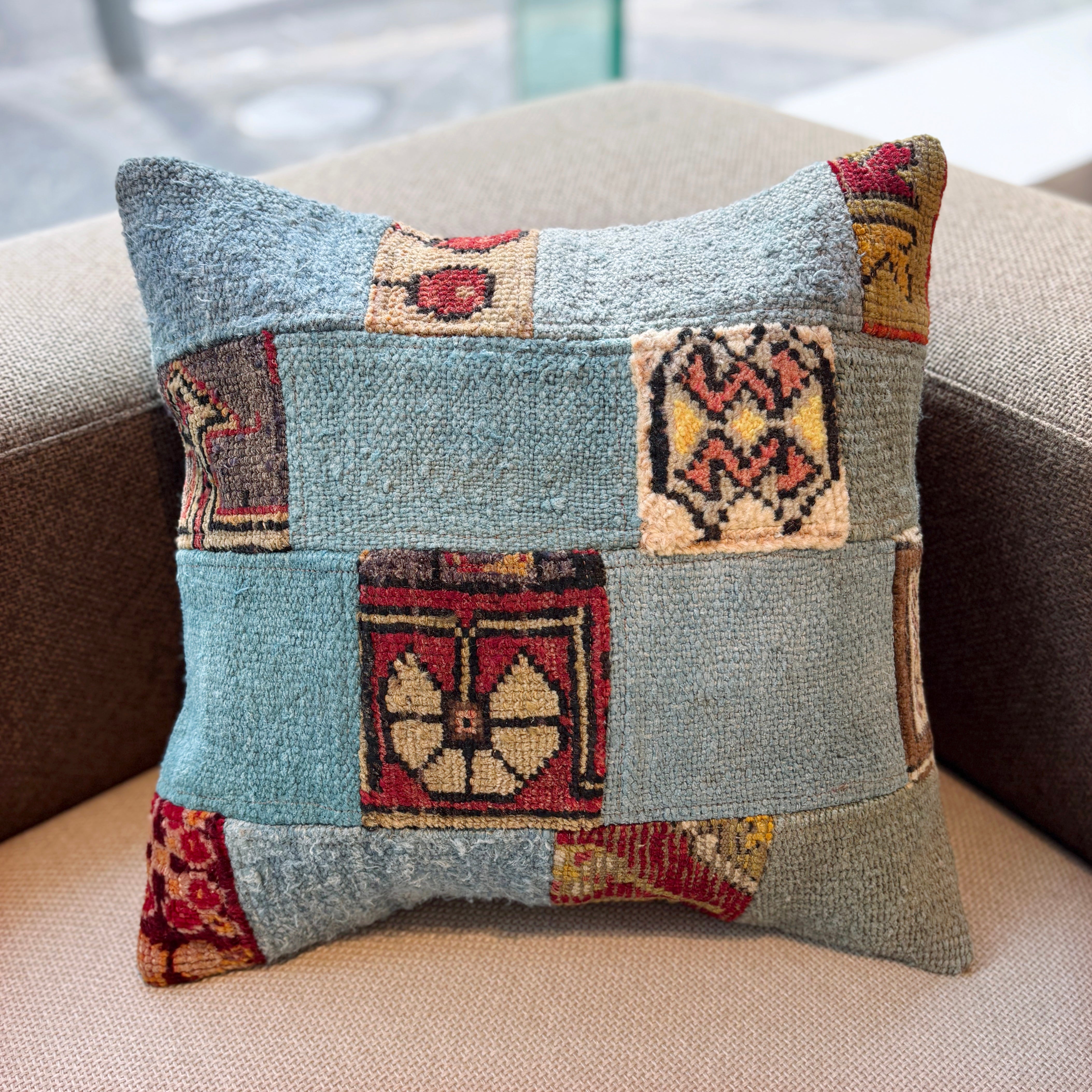 アンティークの絨毯と水色(綿・麻・ウール)のキリムがパッチワークされ作られた、とてもめずらしく貴重なクッションです。