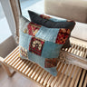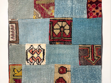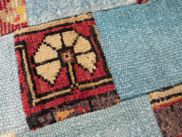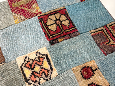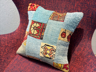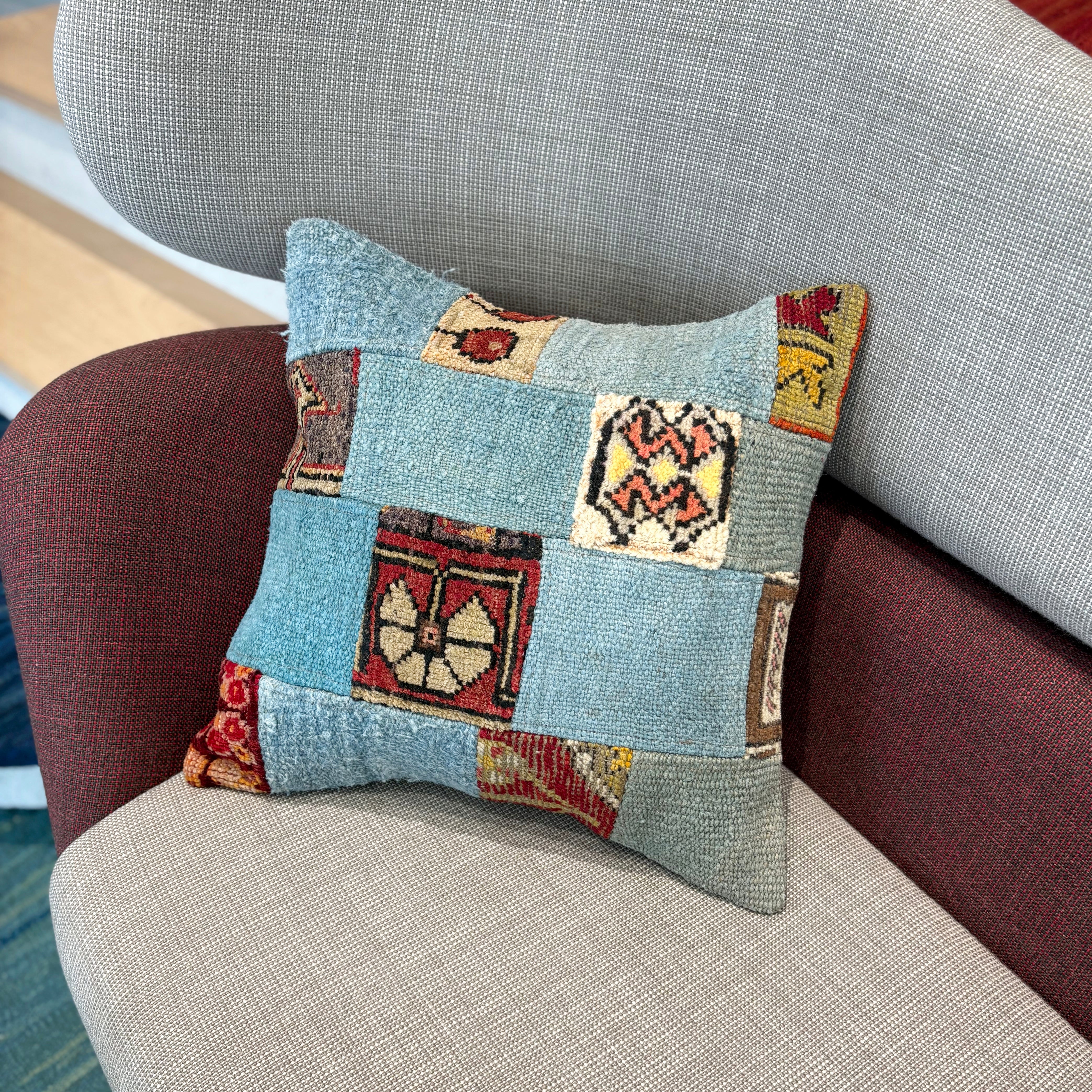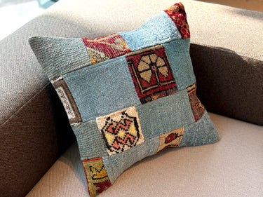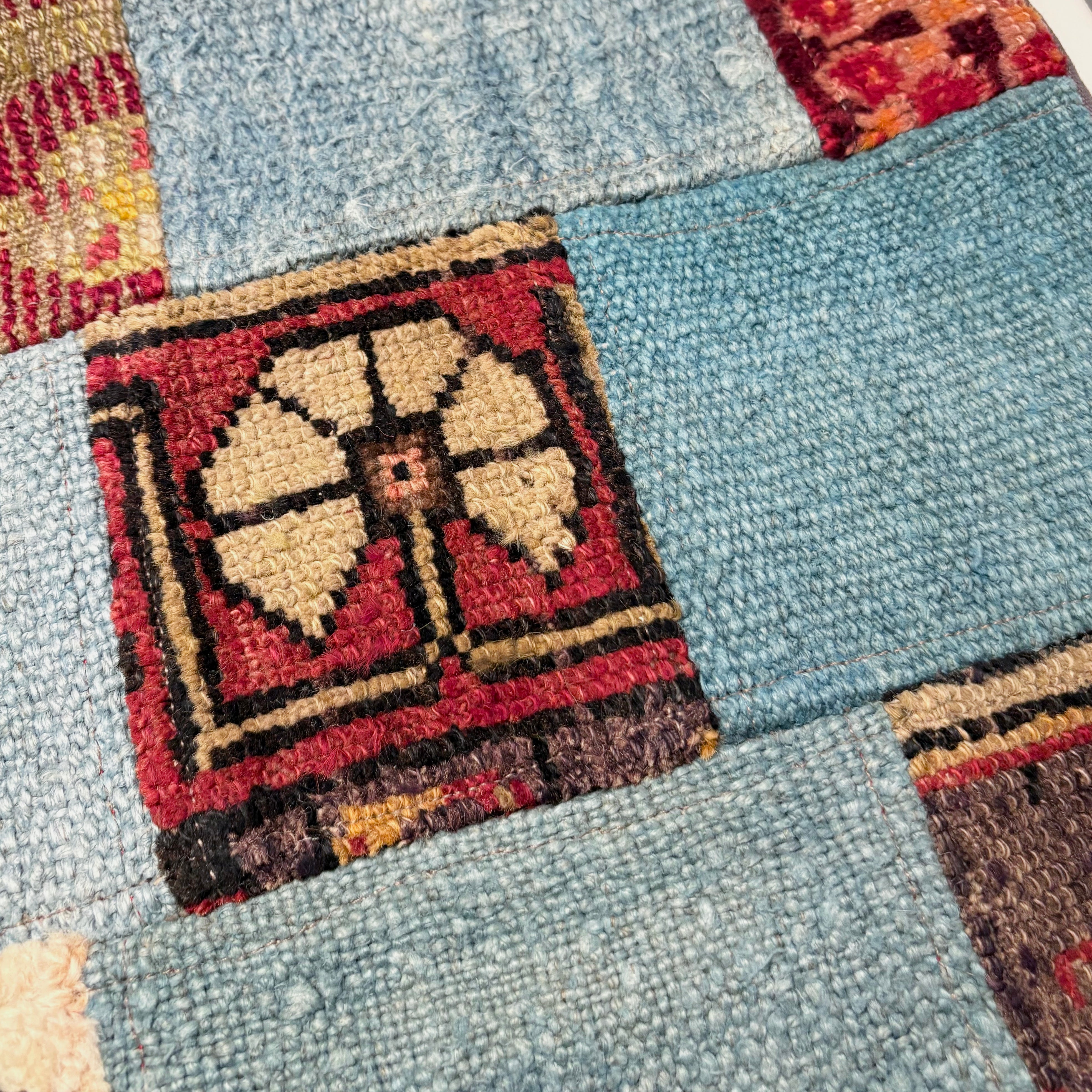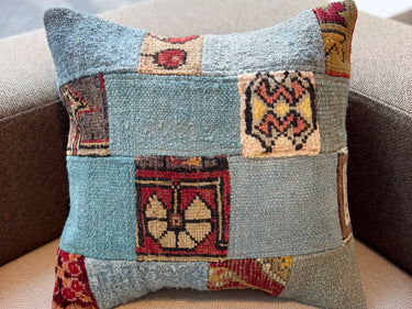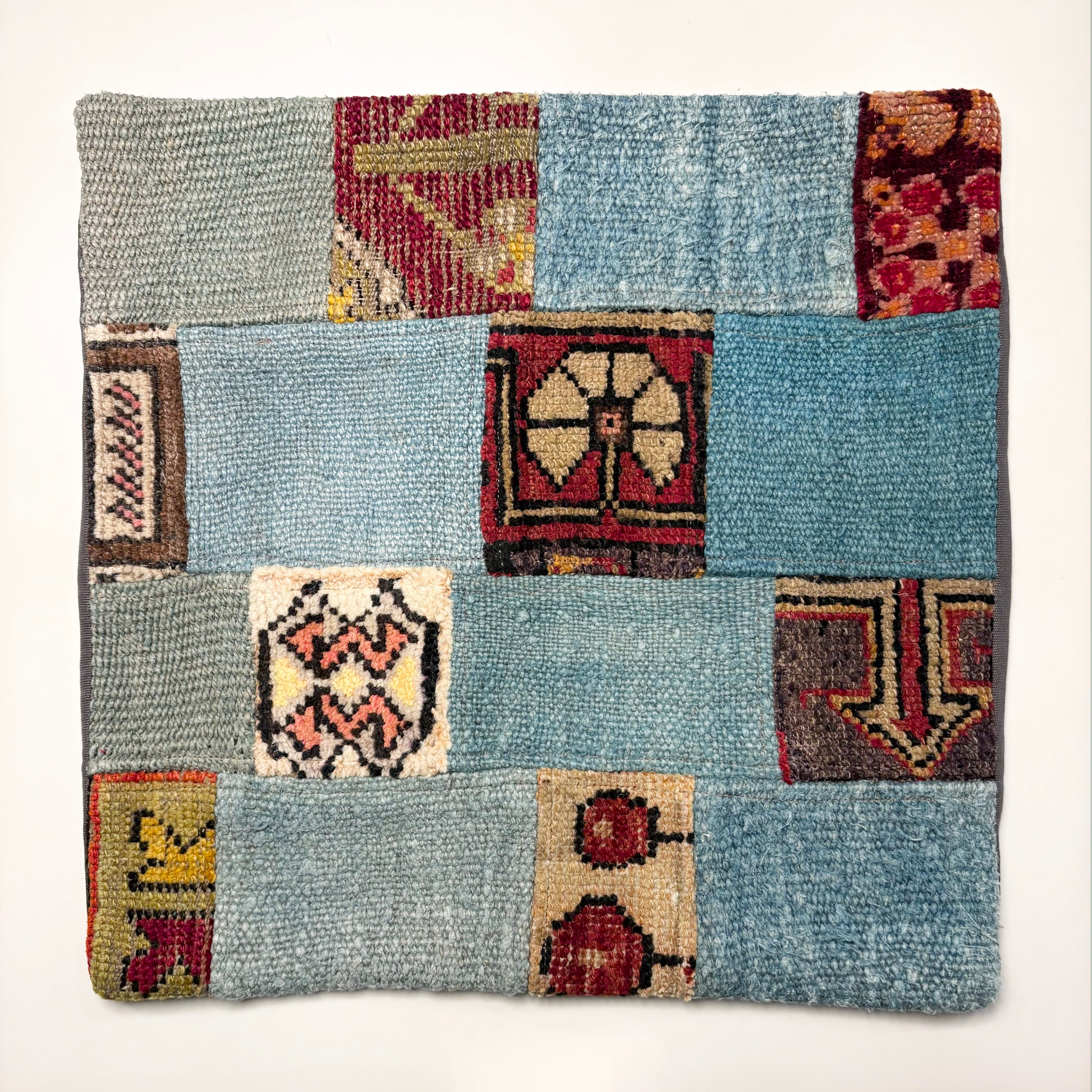 アンティークの絨毯と水色(綿・麻・ウール)のキリムがパッチワークされ作られた、とてもめずらしく貴重なクッションです。