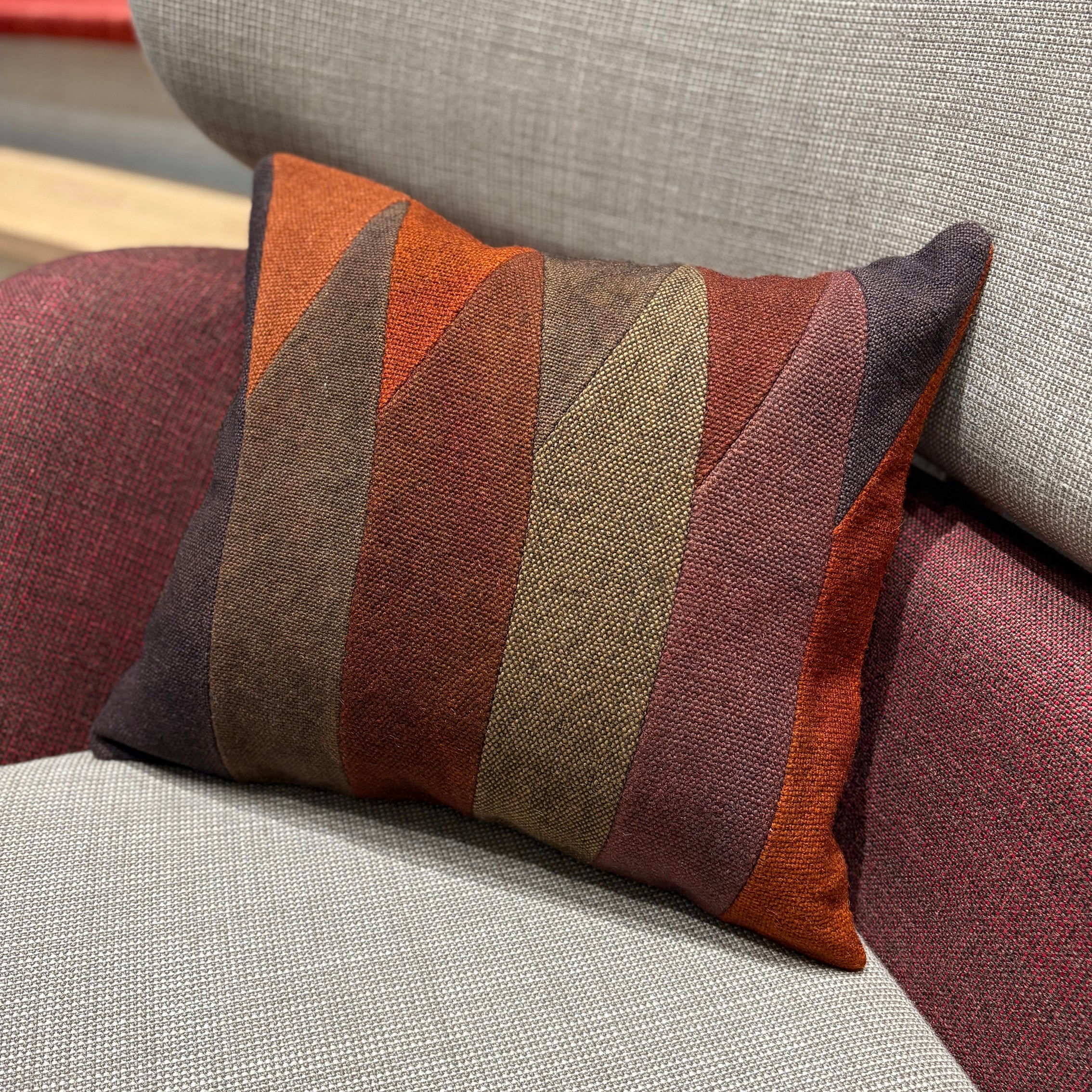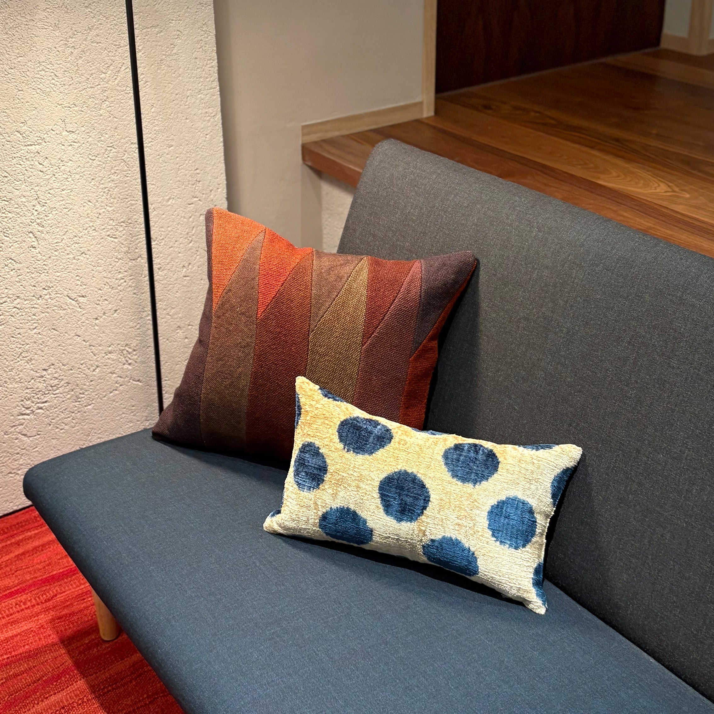 草木染めされた暖色系の色が組み合わされ、温かみがあり落ち着いた雰囲気を作り出してくれます。