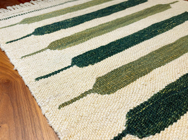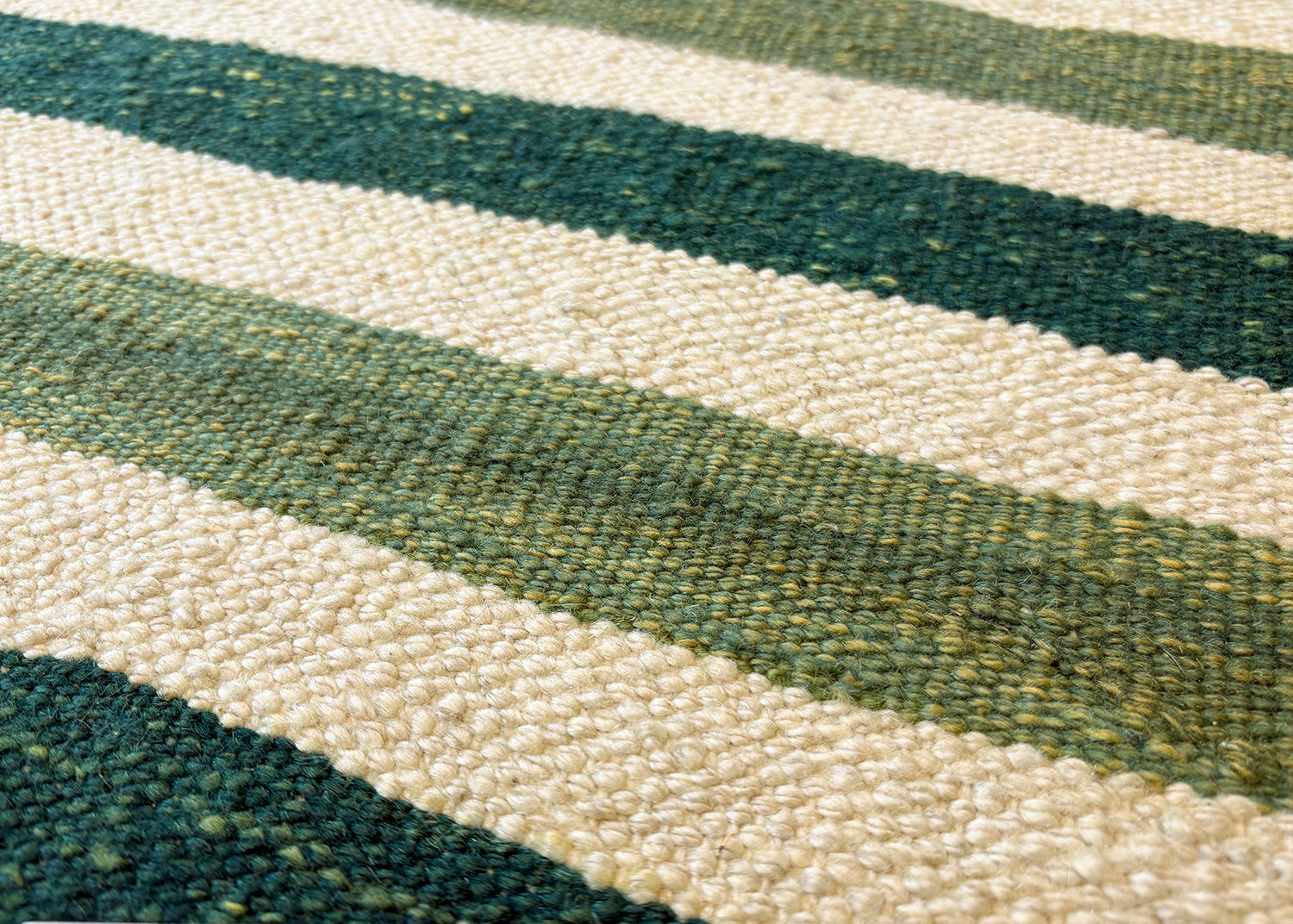 特にウールの糸は、現在では大変珍しい木のコマを用いた素朴な手紡ぎで、文様部分の緑色は草木染めされています。
