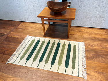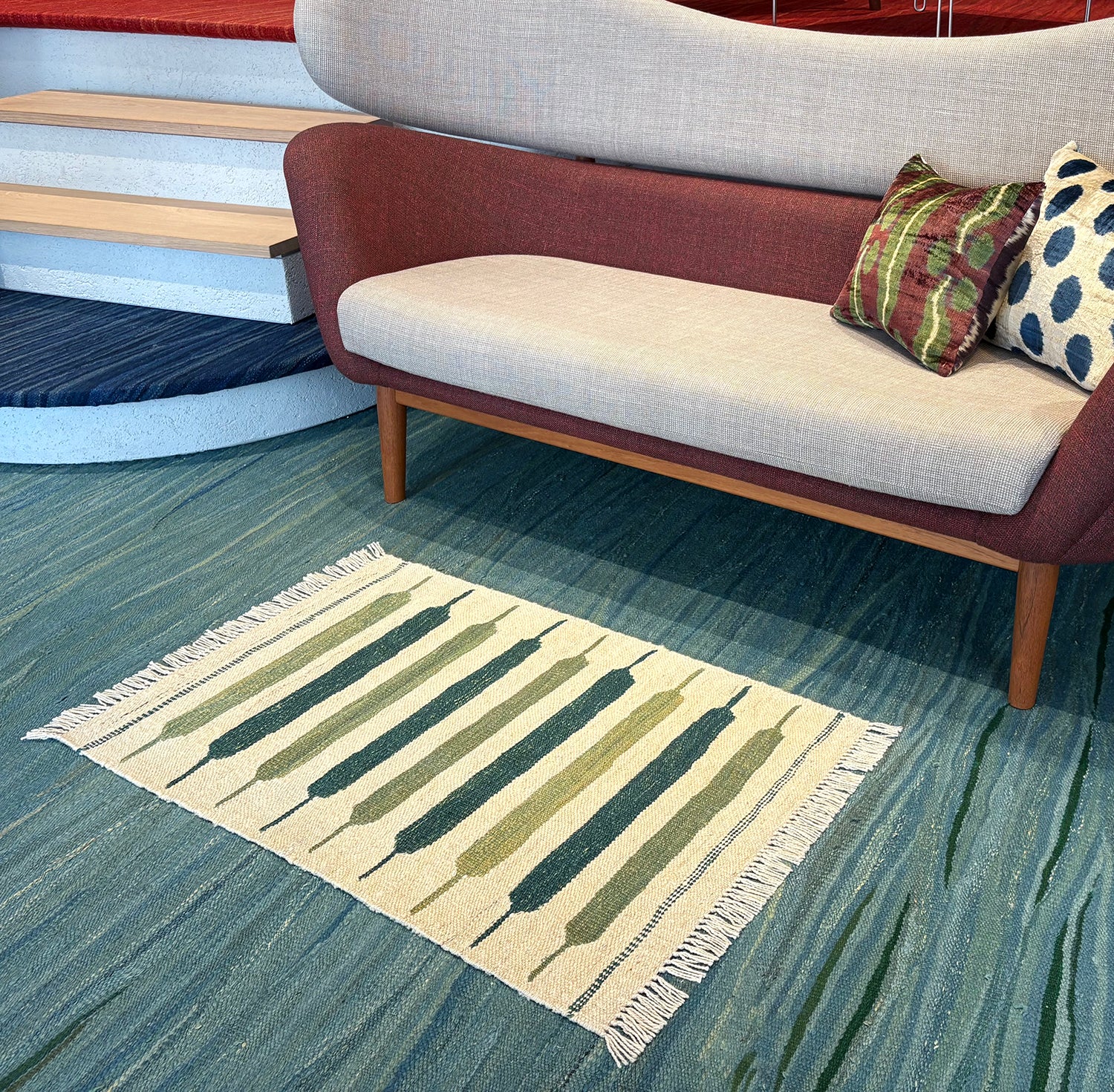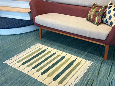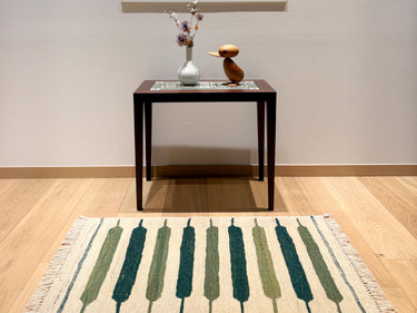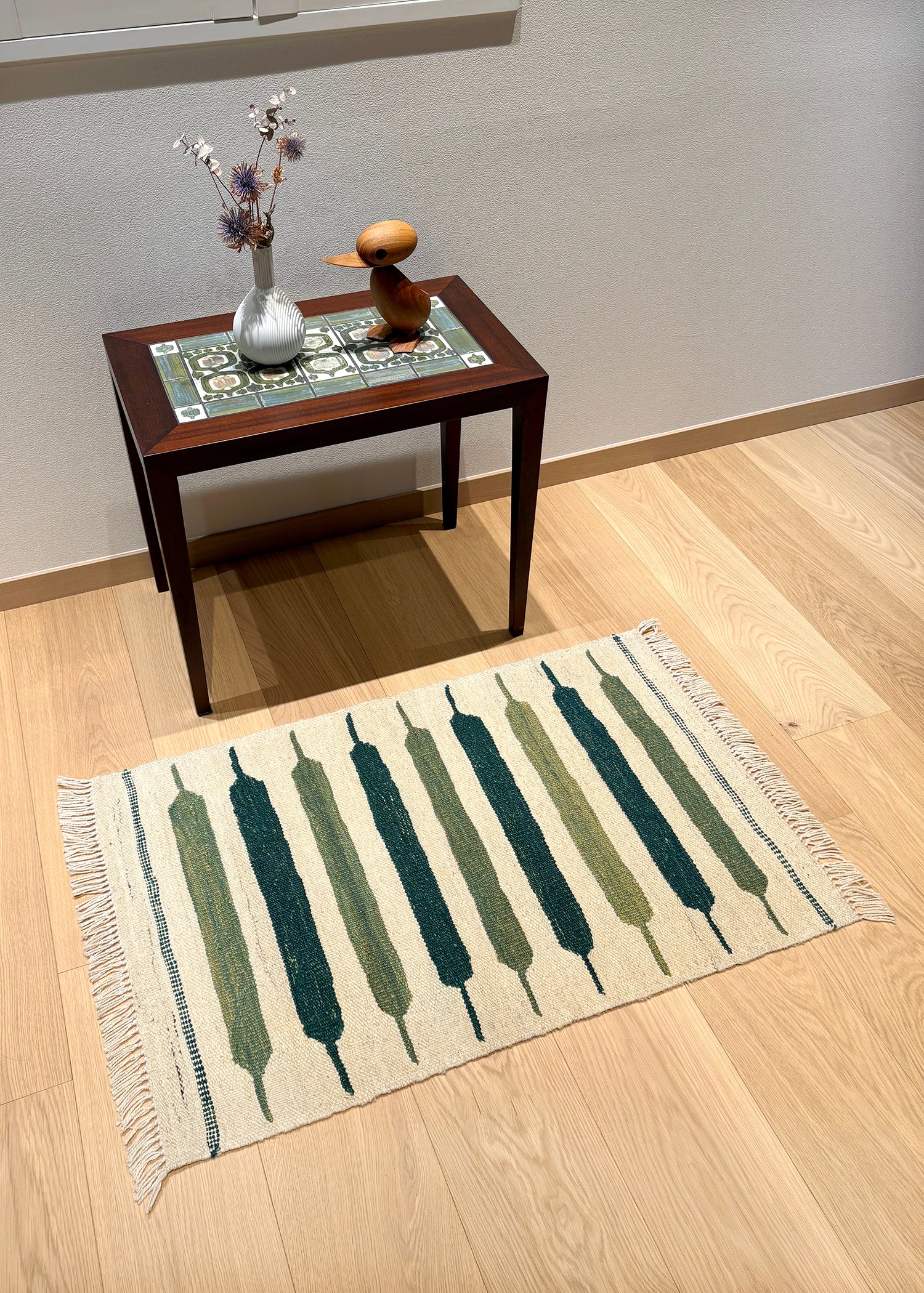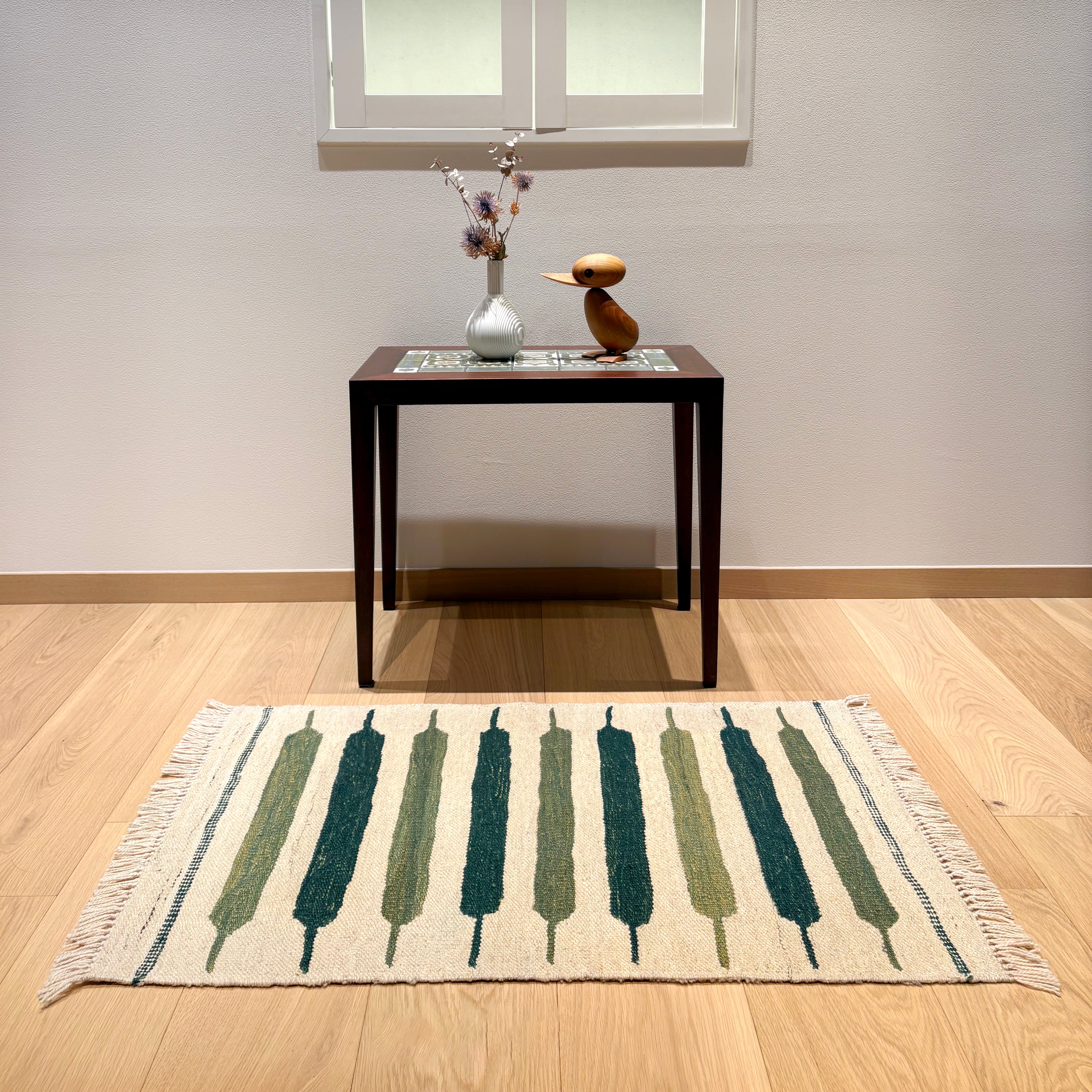 サイズ的には、一人掛けチェアなどと合わせてお使いいただくか、玄関マットや、ベッドサイドの床に置く絵、壁に掛けるタペストリーとしてお使いいただけます。