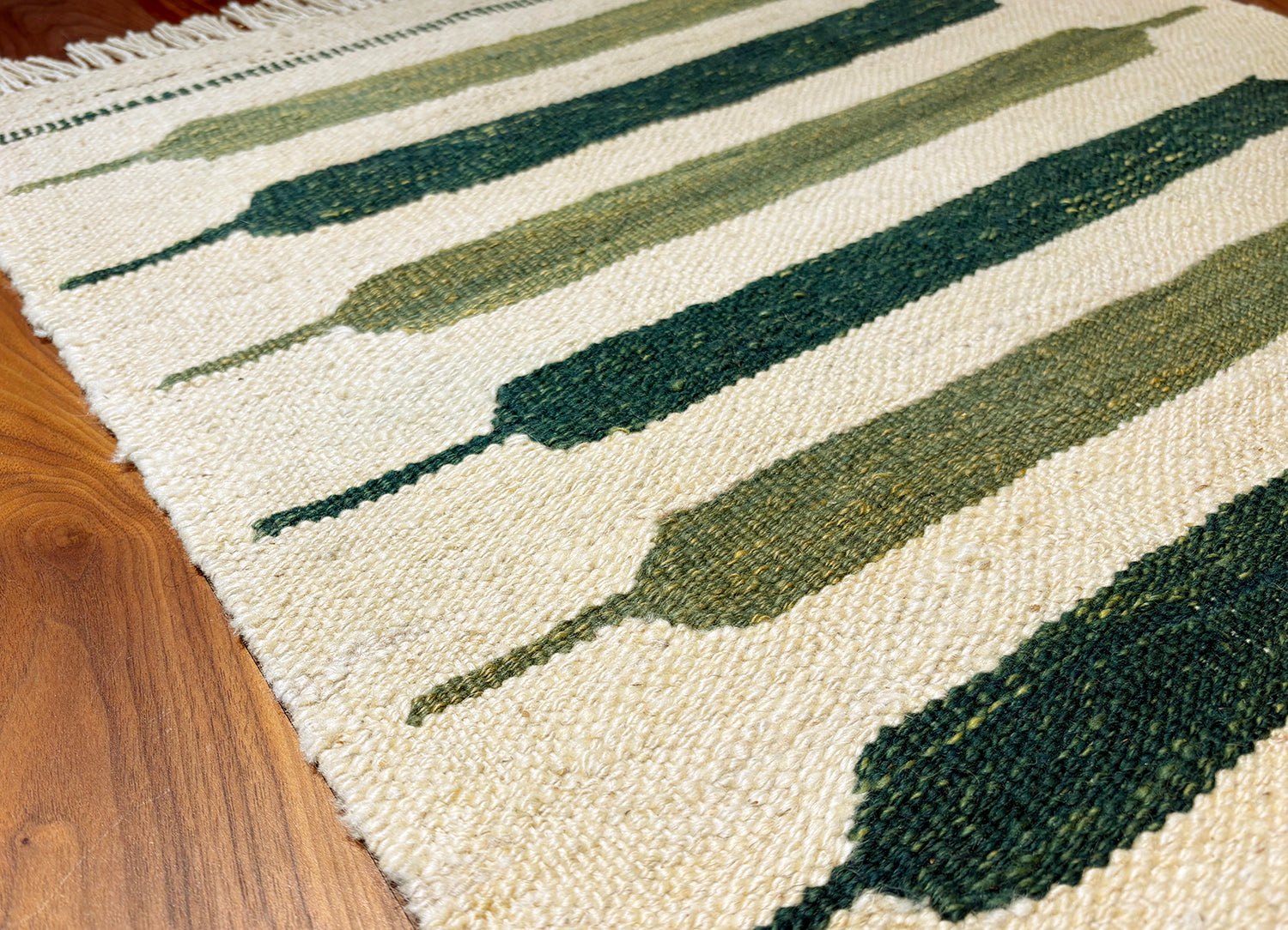 そして、このキリムの魅力は、文様の中や地模様の中、その全てに渡って、『アブラッシュ』(糸の色の濃淡と太さの大小がつくり出す織りの風合い)の技法が、美しく丁寧に織り込まれ、織り手のセンスの良さを感じさせるところにあります。