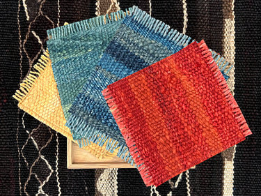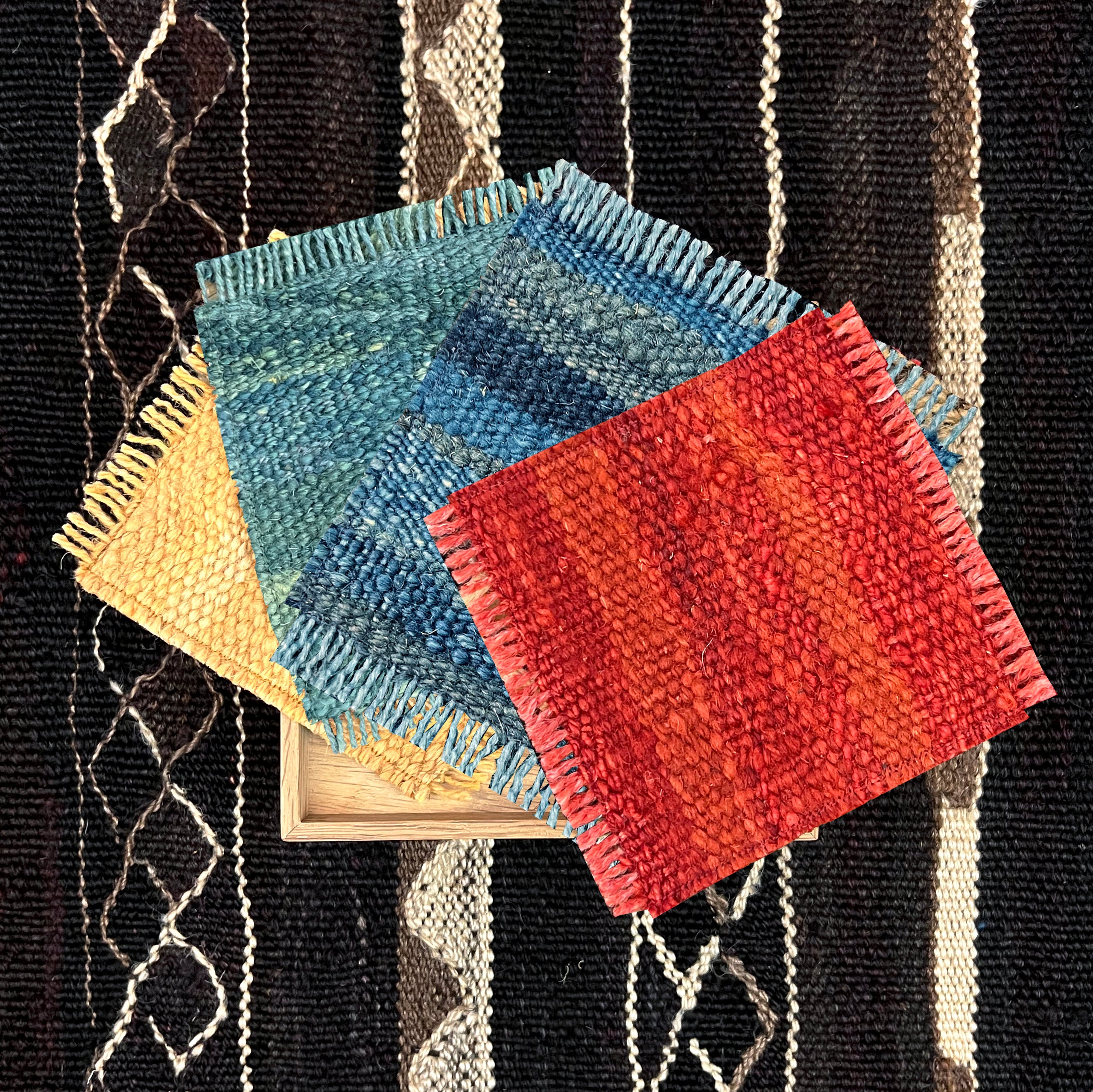 このセットはお客様のお好きな色の組み合わせでコースターをお選びいただけるセットとなっております。キリムで作られたコースターはその場の雰囲気を豊かにし、温かみのある空間にしてくれます。