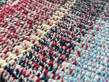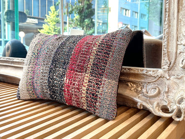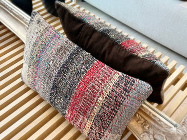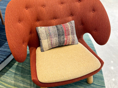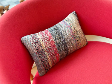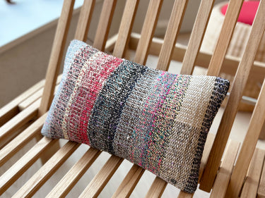 この Kilim Cushion(キリムクッション)は、ROGOBA(ロゴバ)が Old Textile(オールドテキスタイル・裂き織り)を加工して作製した、腰当てにぴったりな大変めずらしいサイズのクッションカバーです。