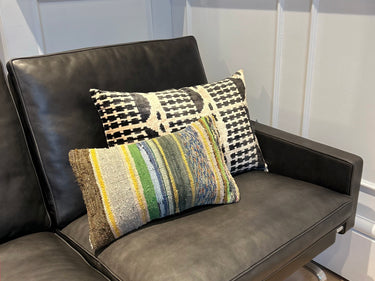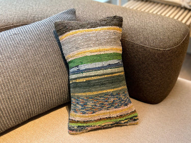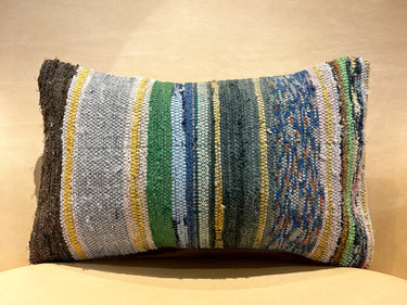 この Kilim Cushion(キリムクッション)は、ROGOBA(ロゴバ)が Old Textile(オールドテキスタイル・裂き織り)を加工して作製した、腰当てにぴったりな大変めずらしいサイズのクッションカバーです。