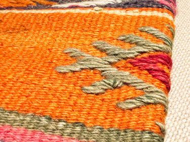 鮮やかなオレンジの地とカラフルな ジジム(文様部分が刺繍されています)の組み合わせが楽しいクッションカバーです。