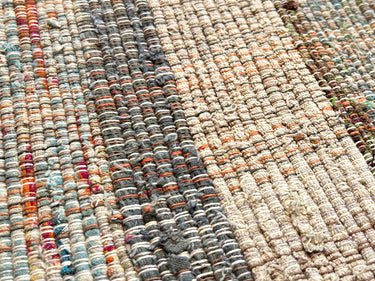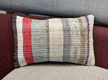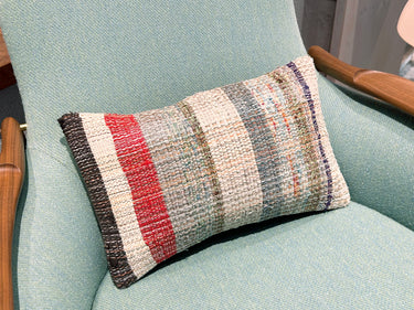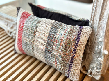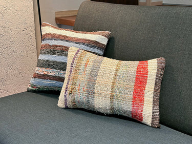 この Kilim Cushion(キリムクッション)は、ROGOBA(ロゴバ)が Old Textile(オールドテキスタイル・裂き織り)を加工して作製した、腰当てにぴったりな大変めずらしいサイズのクッションカバーです。