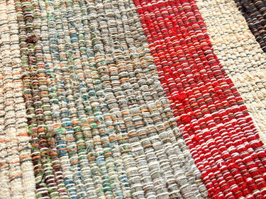 様々な色の細い糸や布が織り込まれた、複雑で豊かな表情が魅力的です。