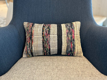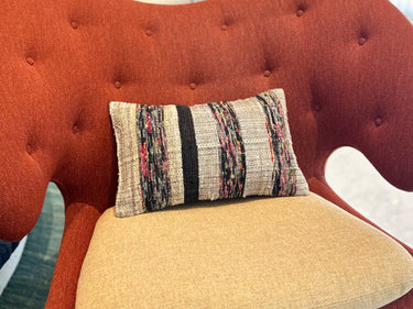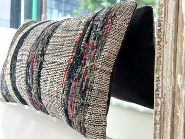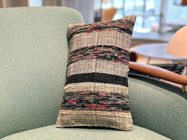この Kilim Cushion(キリムクッション)は、ROGOBA(ロゴバ)が Old Textile(オールドテキスタイル・裂き織り)を加工して作製した、腰当てにぴったりな大変めずらしいサイズのクッションカバーです。
