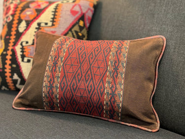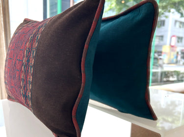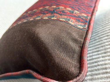 アンティークキリム(ジャジム)と光沢のあるブラウン系のシルクが組み合わされたキリムクッションです。
