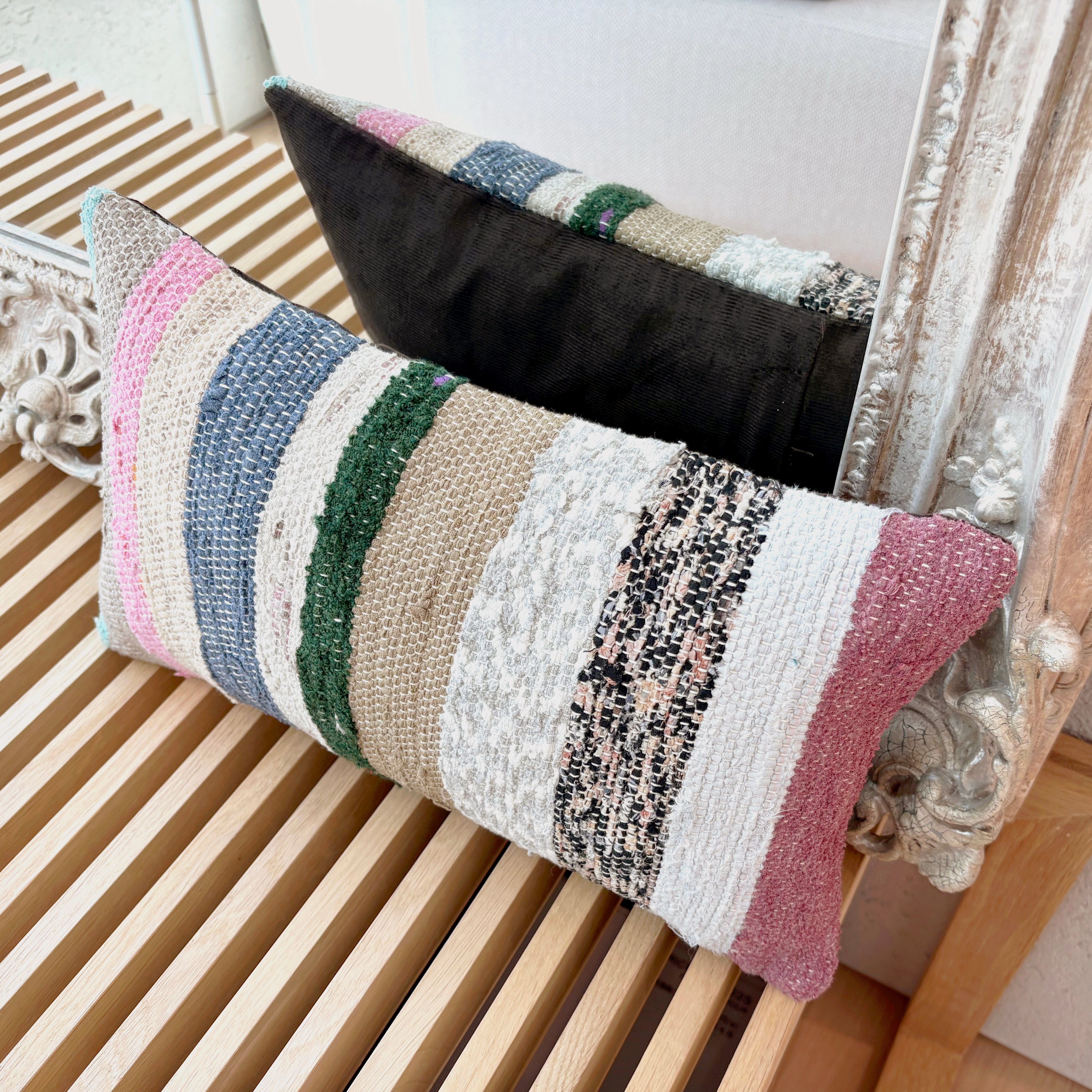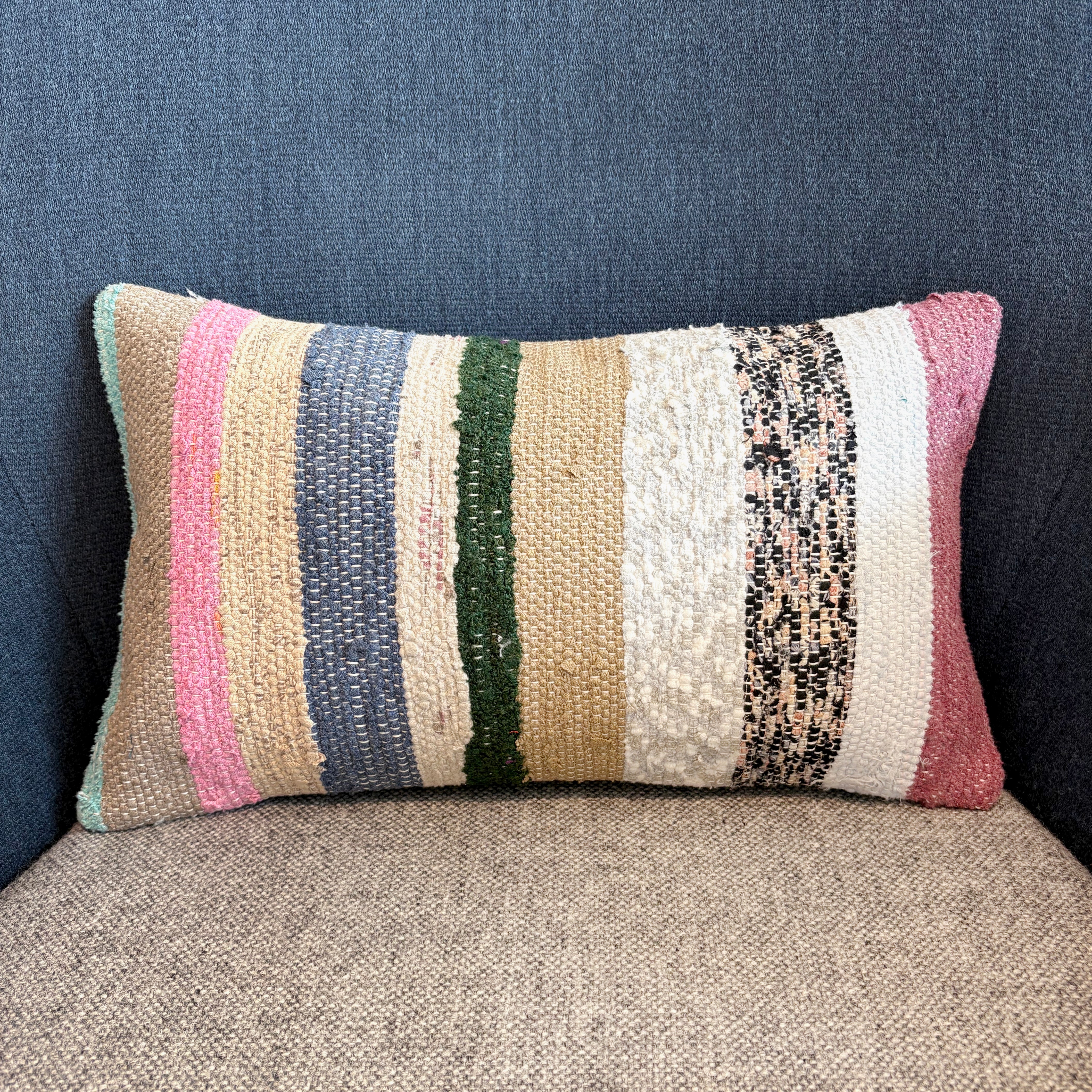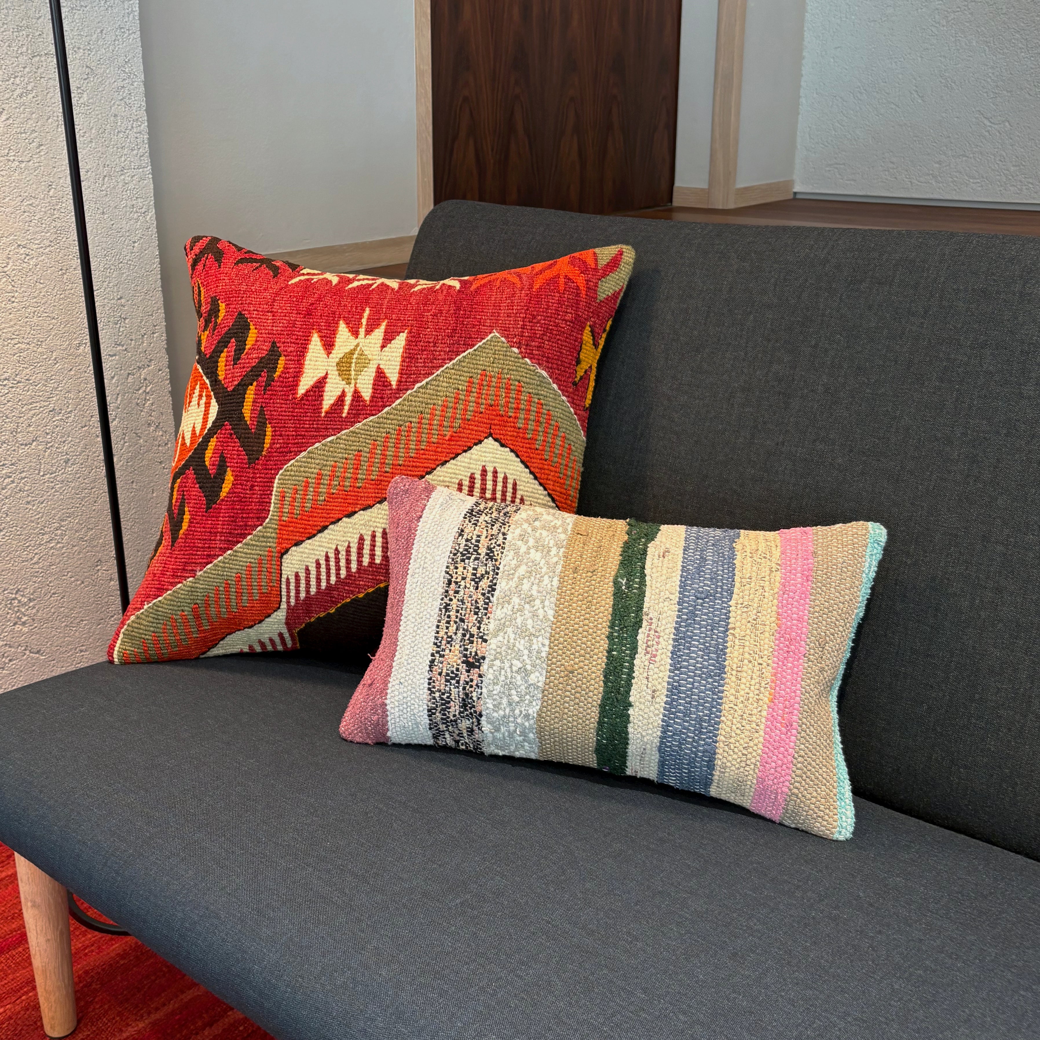 この Kilim Cushion(キリムクッション)は、ROGOBA(ロゴバ)が Old Textile(オールドテキスタイル・裂き織り)を加工して作製した、腰当てにぴったりな大変めずらしいサイズのクッションカバーです。