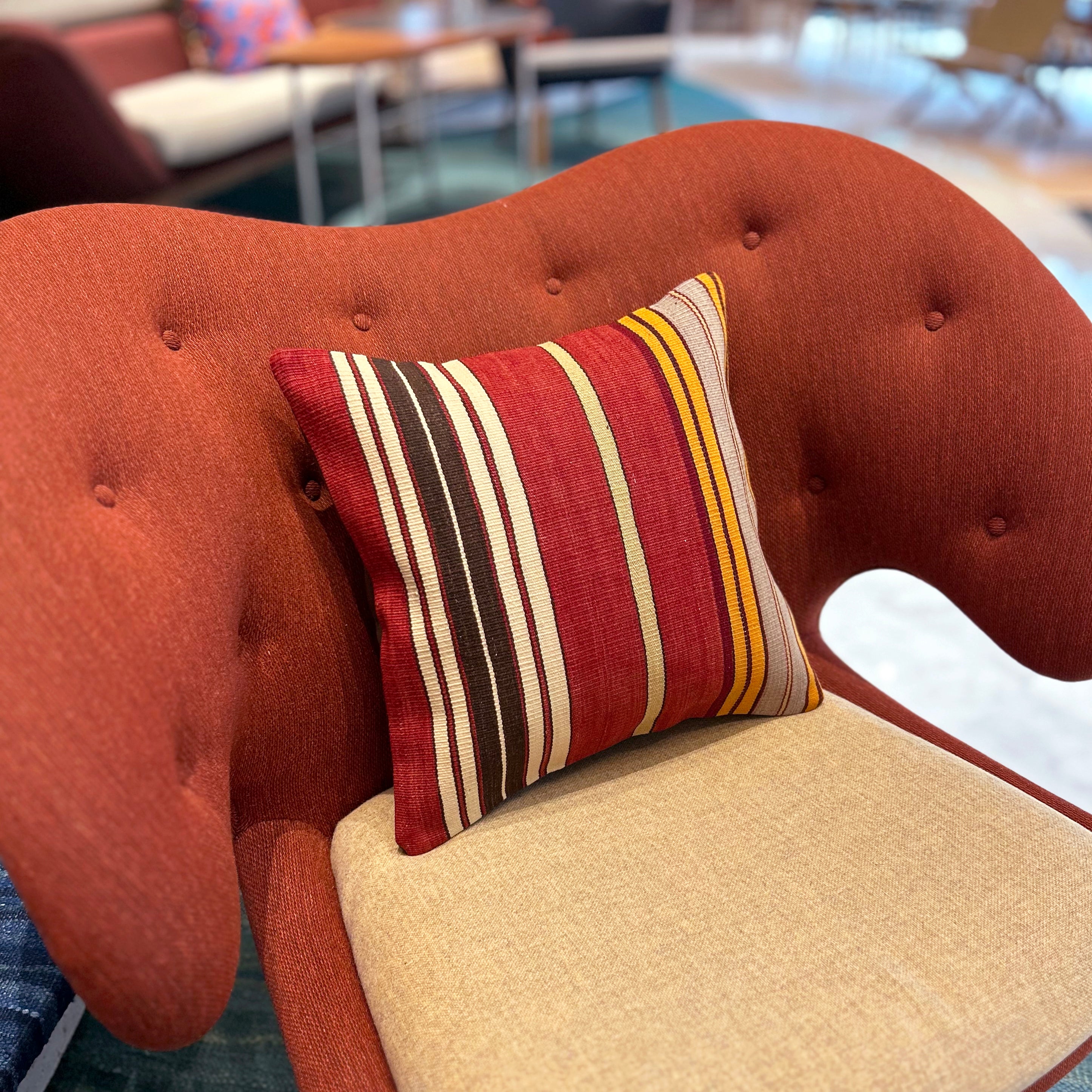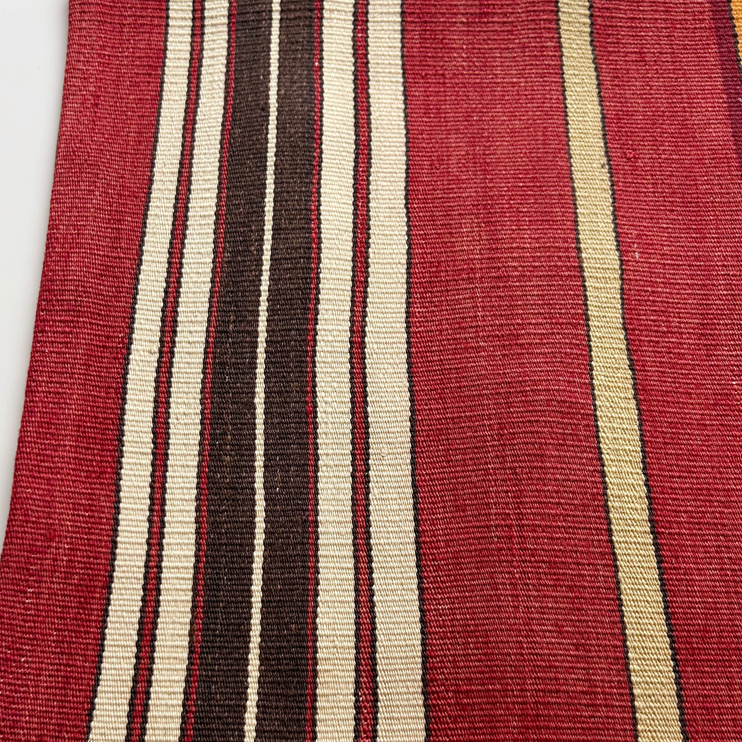 地の赤と黄や白などが使われたストライプとのコントラストがアクセントです。
