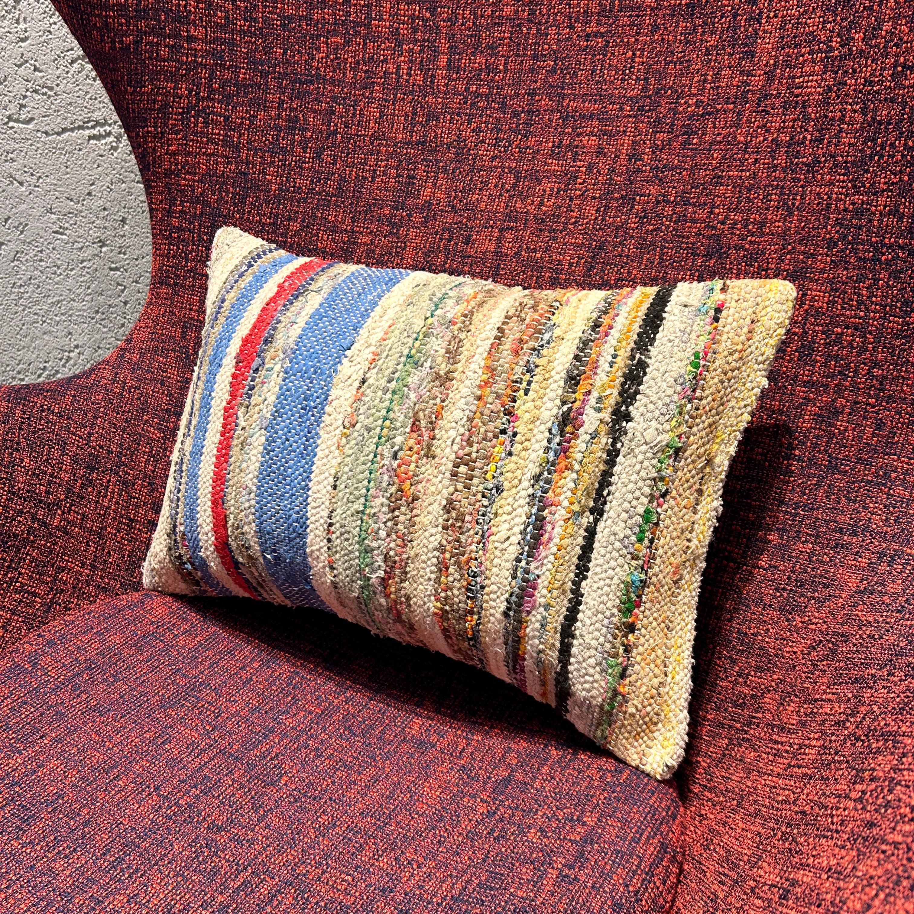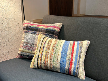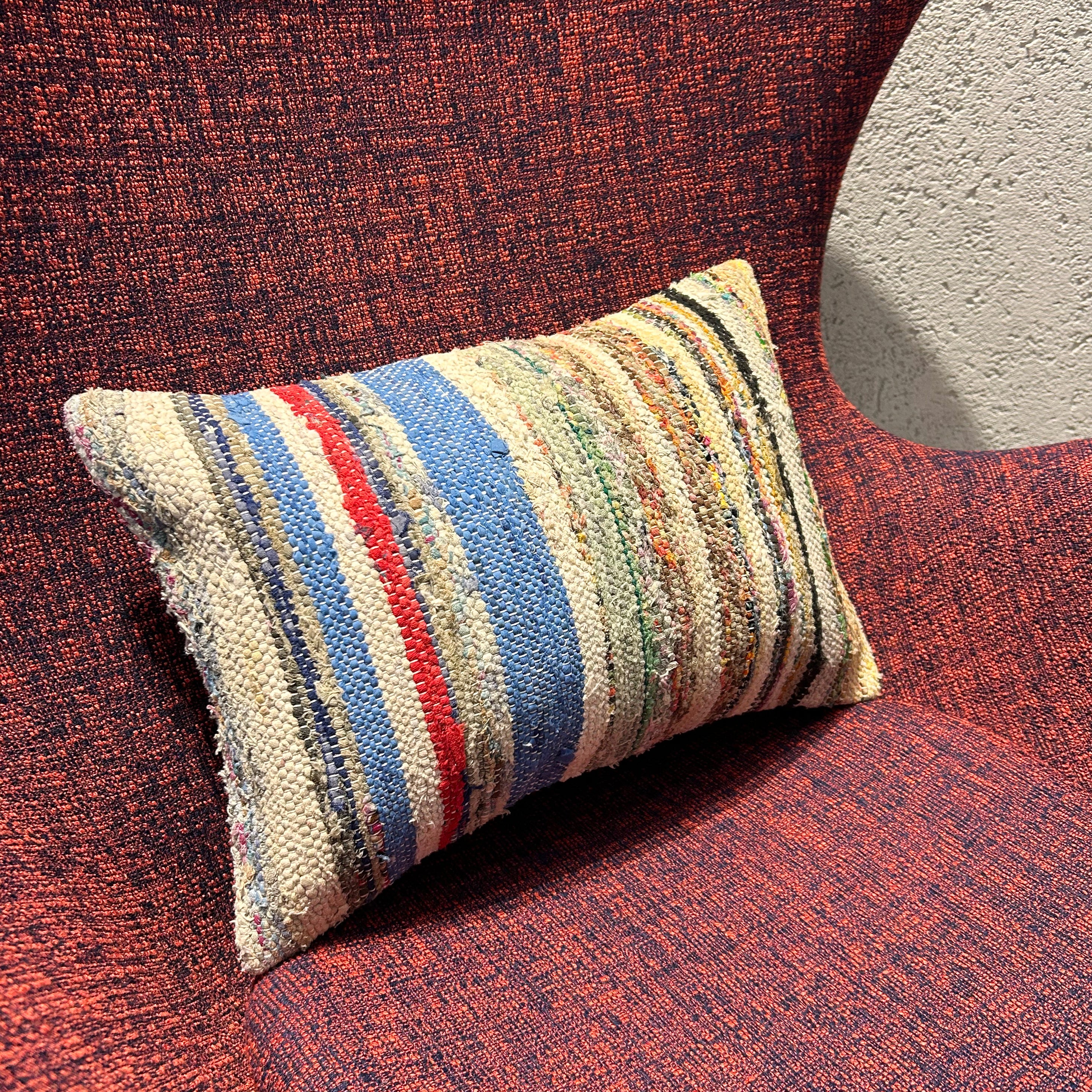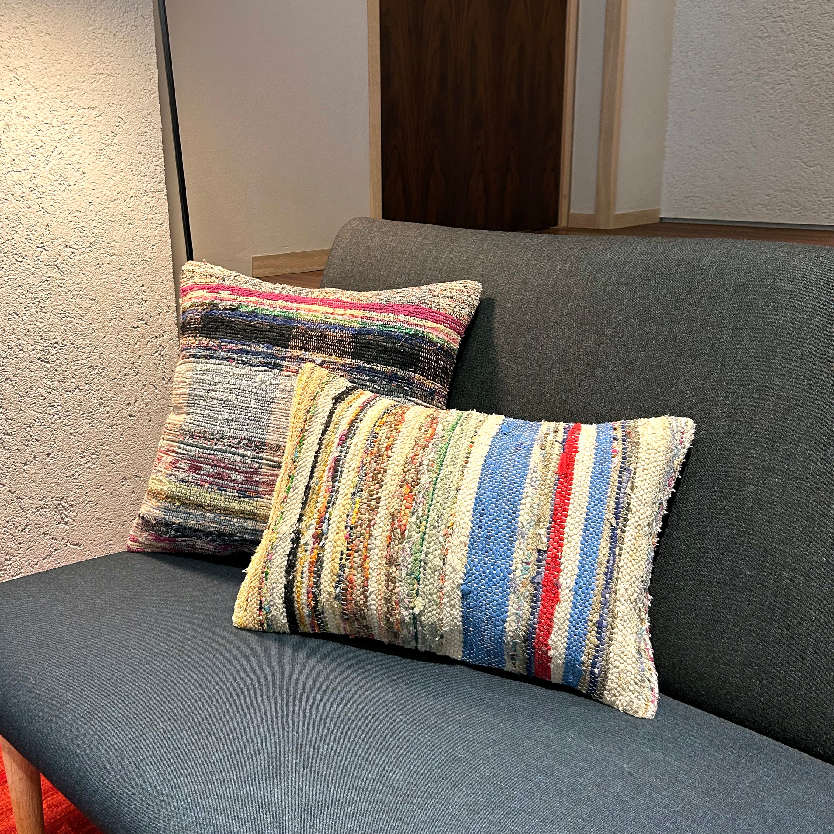 この Kilim Cushion(キリムクッション)は、ROGOBA(ロゴバ)が Old Textile(オールドテキスタイル・裂き織り)を加工して作製した、腰当てにぴったりな大変めずらしいサイズのクッションカバーです。