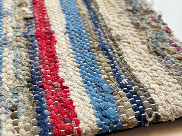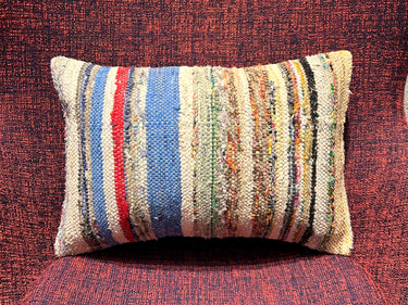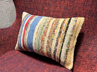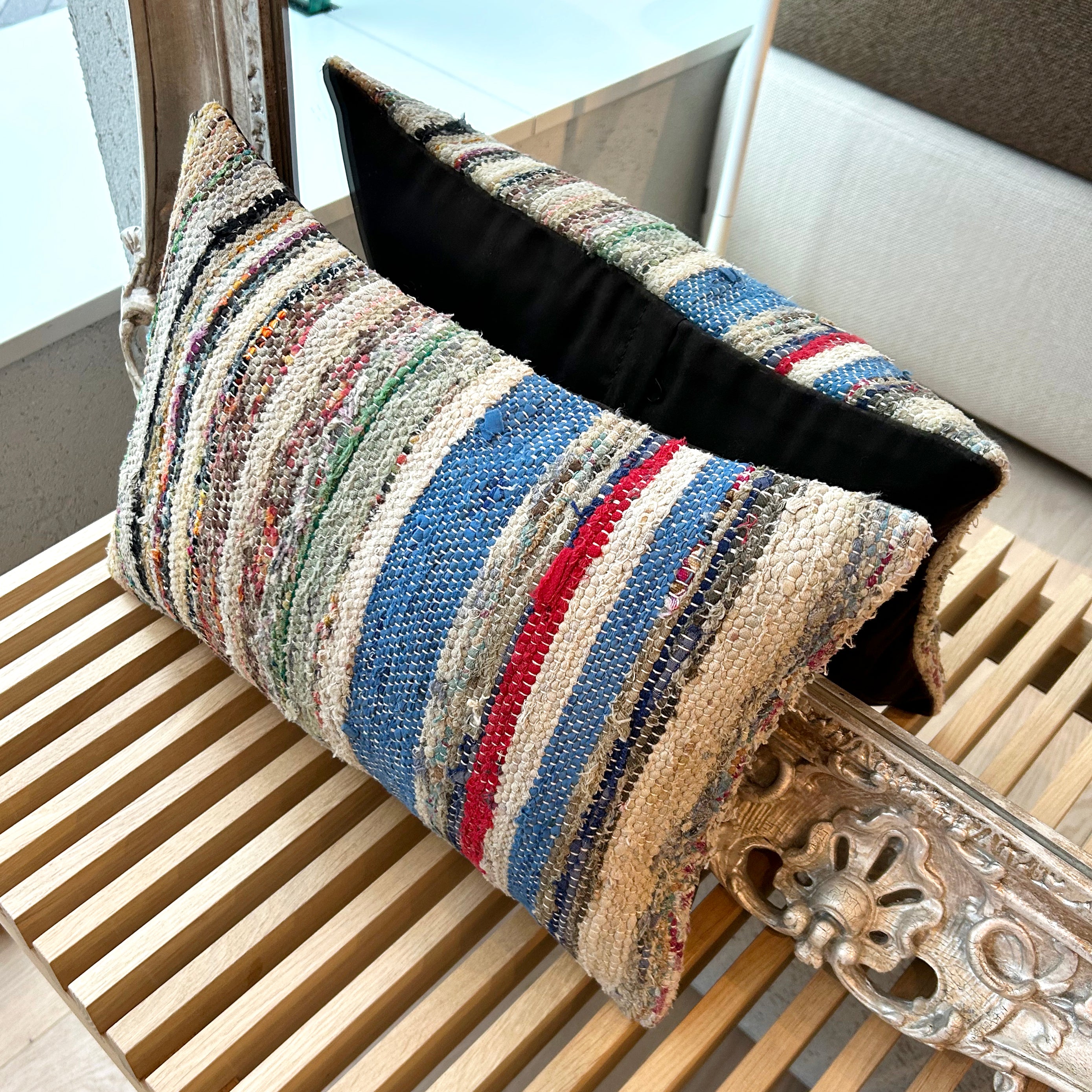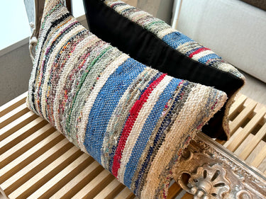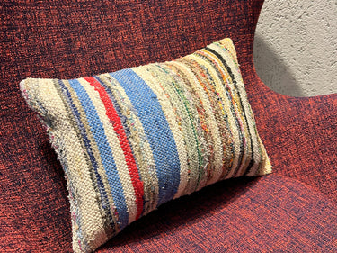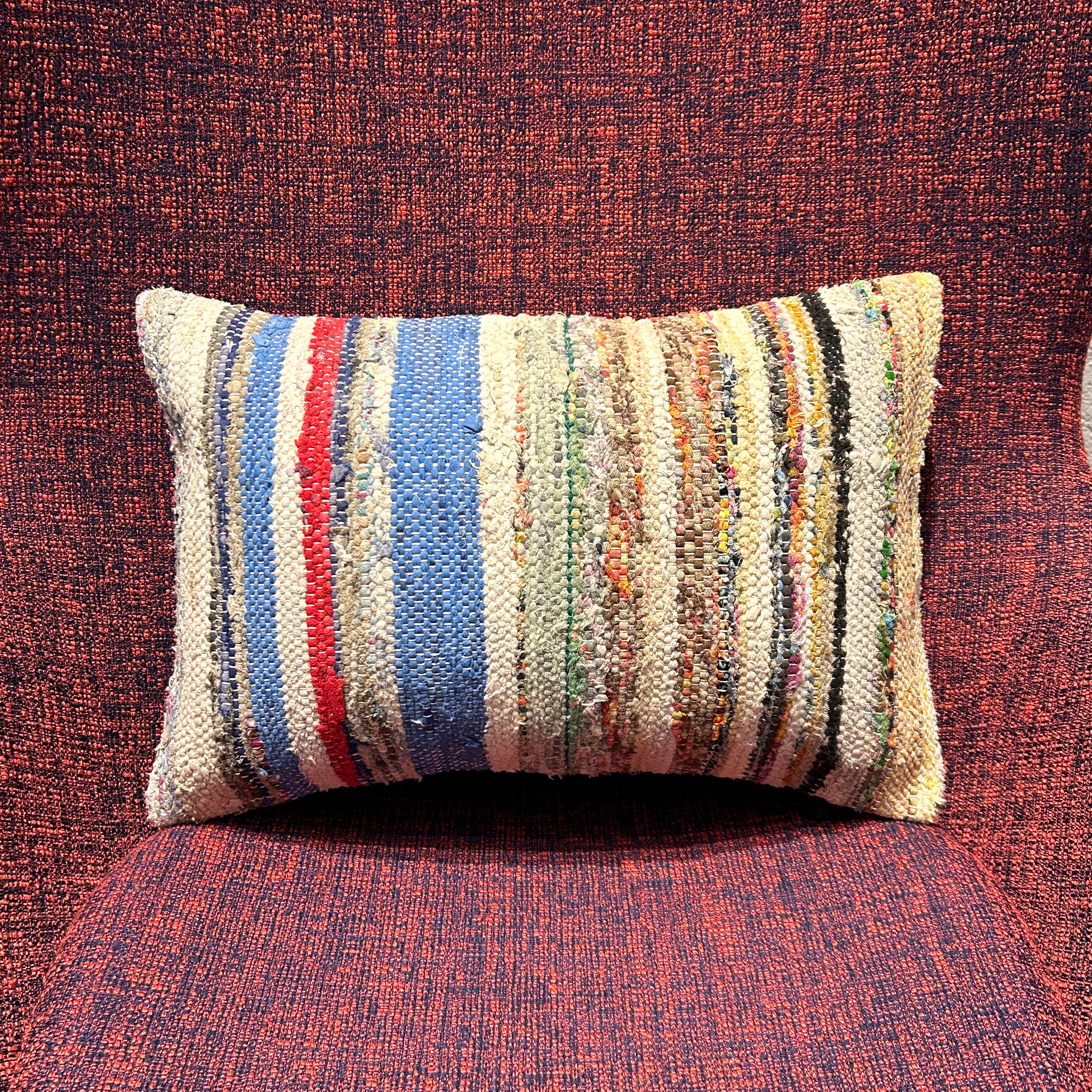この Kilim Cushion(キリムクッション)は、ROGOBA(ロゴバ)が Old Textile(オールドテキスタイル・裂き織り)を加工して作製した、腰当てにぴったりな大変めずらしいサイズのクッションカバーです。