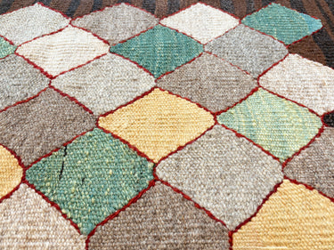 このキリムには、“Flying Birds(フライングバーズ)”と呼ばれる文様が全面に描かれています。菱形のように見える文様が、飛んでいる一羽の鳥を表します。自然の中で生活する遊牧民にとって、『木の実を求めて空を飛んでゆく鳥』と出会うことは、自分たちが生きてゆく上で最も大切な水と、羊の餌である草木の繁芝する場所を教えてくれることから、重要な意味を持っていました。遊牧民はこの飛んでゆく鳥を『幸せを見付け、幸運をもたらす』素敵な模様として好んで織り続けてきました。また、このキリムのようにたくさんの飛んでいる鳥を描くことで、たくさんの幸せが訪れることを願い、その一羽一羽を色違いの糸で織ること(アブラッシュ)で、織り手の気持ちを一層強く表現しています。