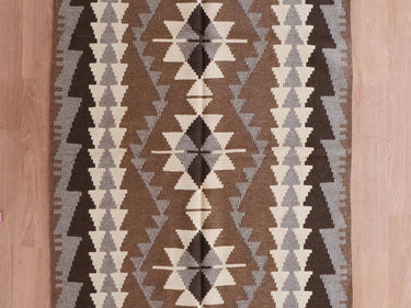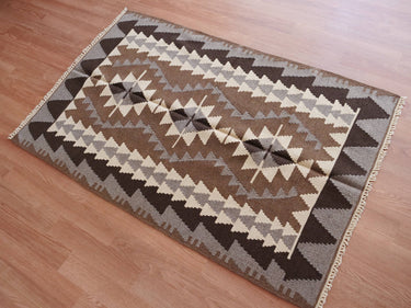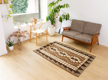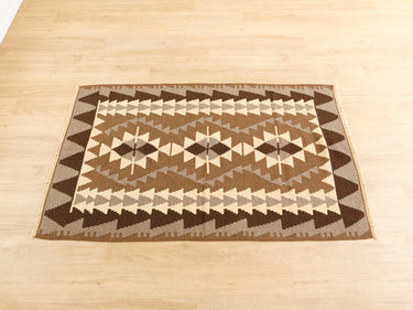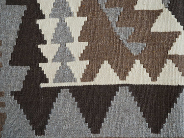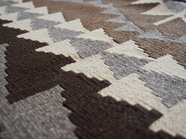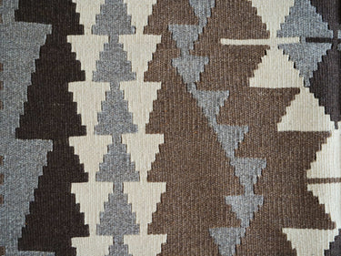 このキリムは、機械紡ぎされたウールの糸を手織りされたものです。そのウールは、羊の皮を革に鞣す工程の中で採取し、機械で糸に紡いでいるため、オイル臭が残っています。また、ここで使われているウールは全て染めていない羊の毛で、そのままの色で織られています。