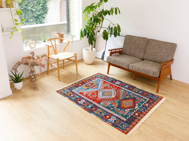 コンヤの現代キリムの中でも上質なこのキリムは、車輪を手で回す“糸車(紡ぎ車)”を用いてウールを紡ぎ、できあがった糸を草木染めし、丁寧に織られたものです。