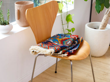 サイズ的には、一人掛けチェアなどと合わせてお使いいただくか、広い玄関のマットや、床に置く絵、壁に掛けるタペストリーなど、インテリアのアクセントとしてお使いいただけます。