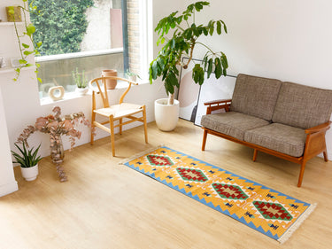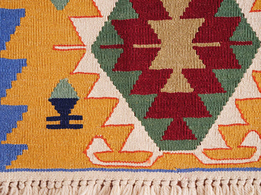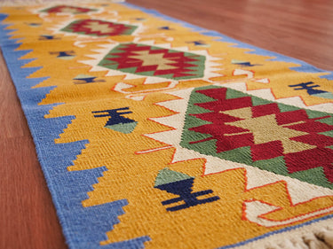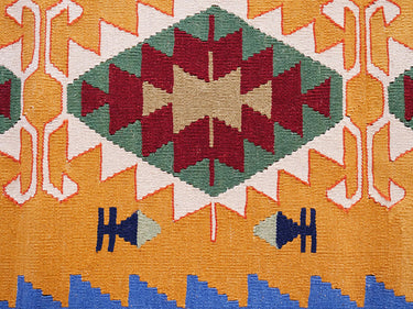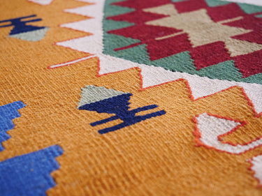 このキリムは、機械紡ぎされたウールを化学染料で染め、手織りされたものです。そのウールは、羊の皮を革に鞣す工程の中で採取し、機械で糸に紡いでいるため、オイル臭が残っている場合もございます。