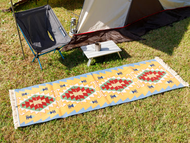 サイズ的には、ソファーの足元や廊下の敷物、キッチンマット、床に置く絵など、インテリアのアクセントとしてお使いいただけます。キャンプの際にもご利用頂けます。