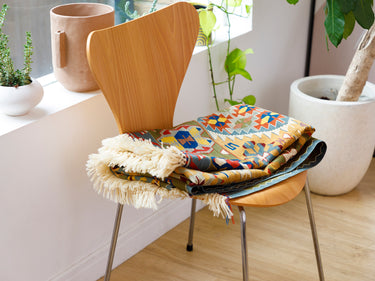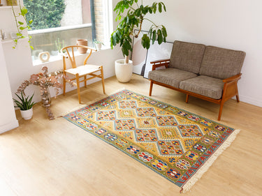 このキリムは、機械紡ぎされたウールを化学染料で染め、丁寧に手織りされたものです。ウールの糸は機械紡ぎされてはいますが、放牧されている羊から人の手で刈り取ったウールを使っているため機械紡ぎのキリム(ウシャク産やカイセリ産など)によくあるオイル臭はありません。