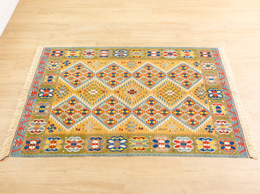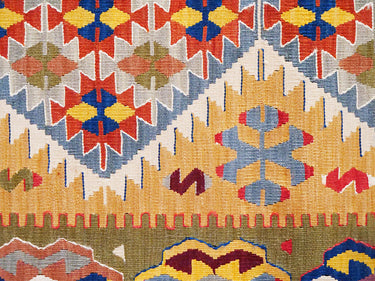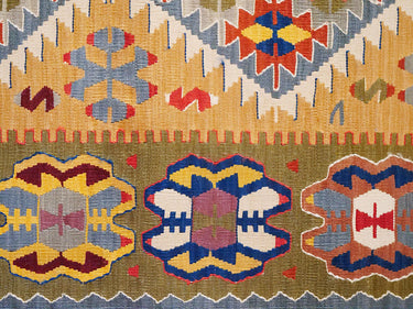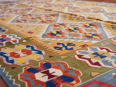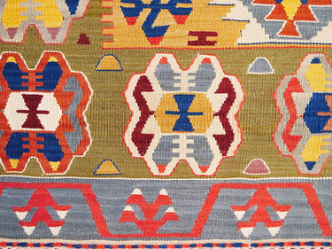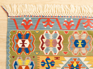 このキリムの文様・デザインは、とてもユニークで、現代的な配色とあいまって、非常に緻密で均整の取れたとても華やかで美しいものです。