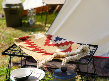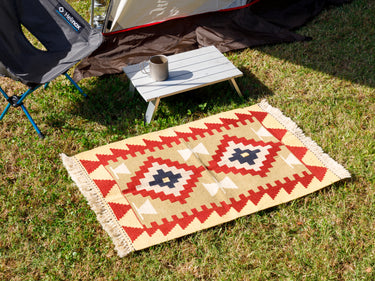 サイズ的には、一人掛けチェアなどと合わせてお使いいただくか、玄関マットや、床に置く絵、壁に掛けるタペストリーなど、インテリアのアクセントとしてお使いいただけます。