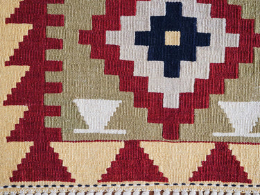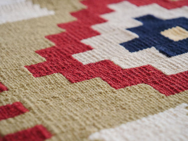 このキリムは、機械紡ぎされたウールを化学染料で染め、手織りされたものです。そのウールは、羊の皮を革に鞣す工程の中で採取し、機械で糸に紡いでいるため、オイル臭が残っている場合もございます。