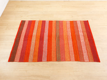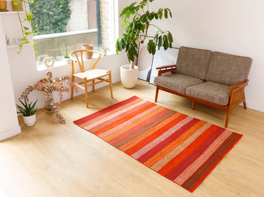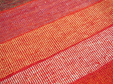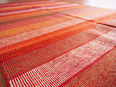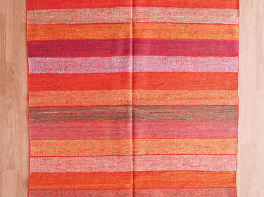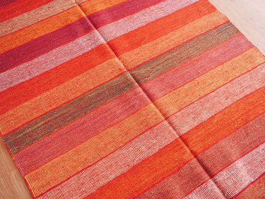 コンヤの現代キリムの中でも上質なこのキリムは、車輪を手で回す“糸車(紡ぎ車)”を用いてウールを紡ぎ、できあがった糸を草木染めし、丁寧に織られたものです。