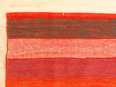 またこのキリムのデザインおよび織りに現れた表情は、コンヤのキリムとしては非常に斬新で、約20年前に生まれたものです。シンプルなデザインでありながら、織り手のセンスを示すアブラッシュも地模様の中に美しく現れ、インテリアを豊かに演出するユニークな一枚です。両端のフリンジが見えないように折り返しの処理がされていることも、シンプルな印象を強めています。