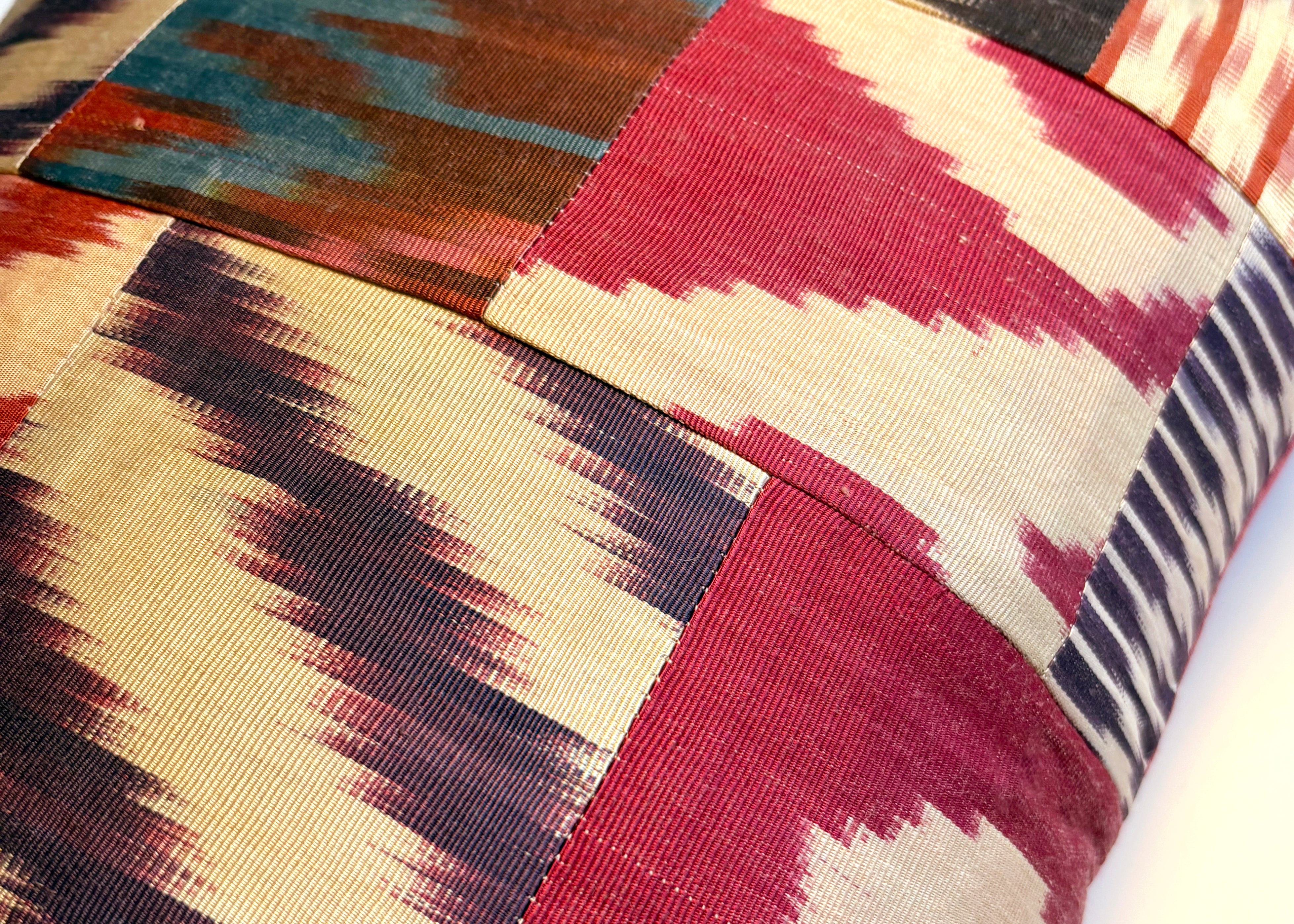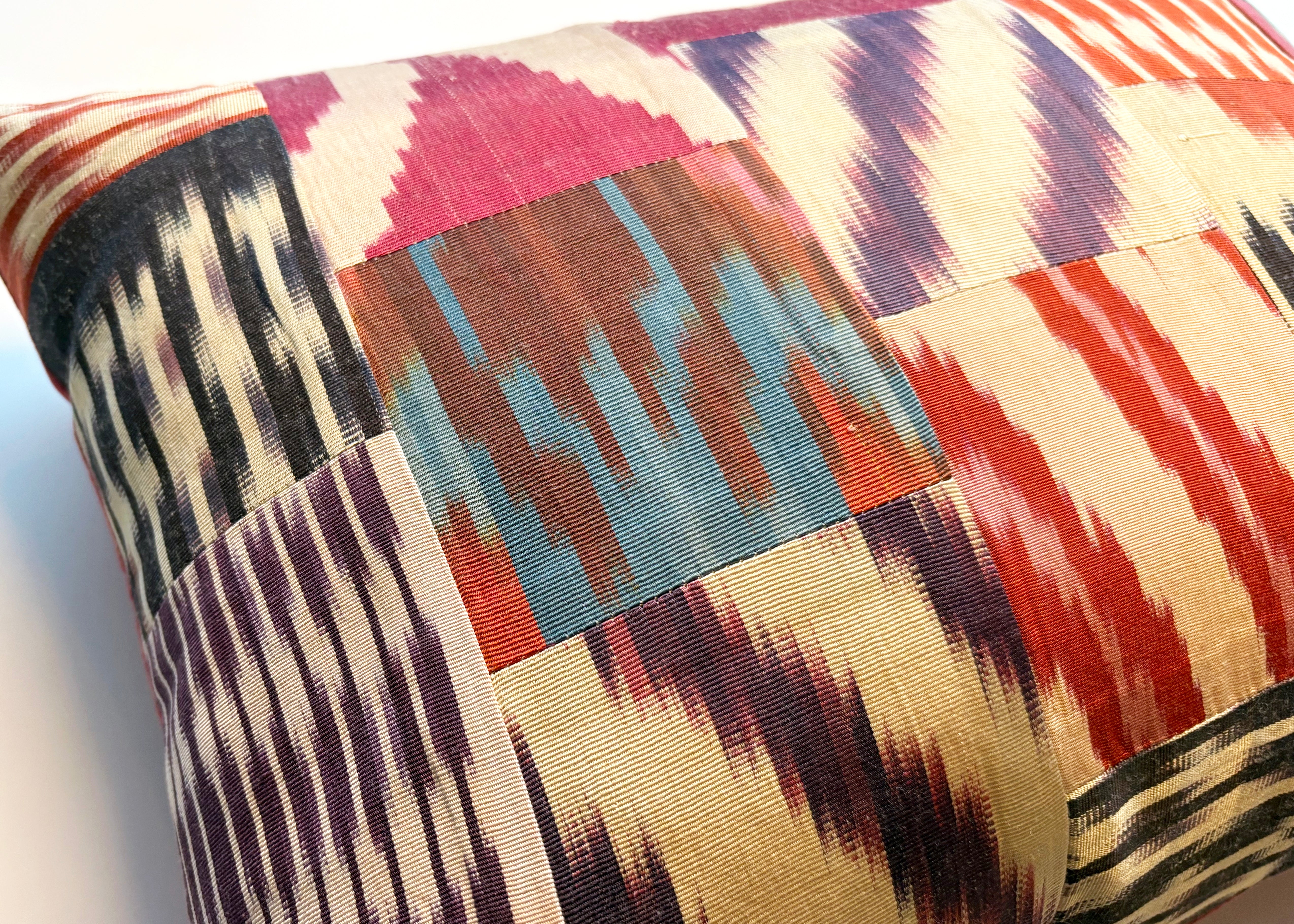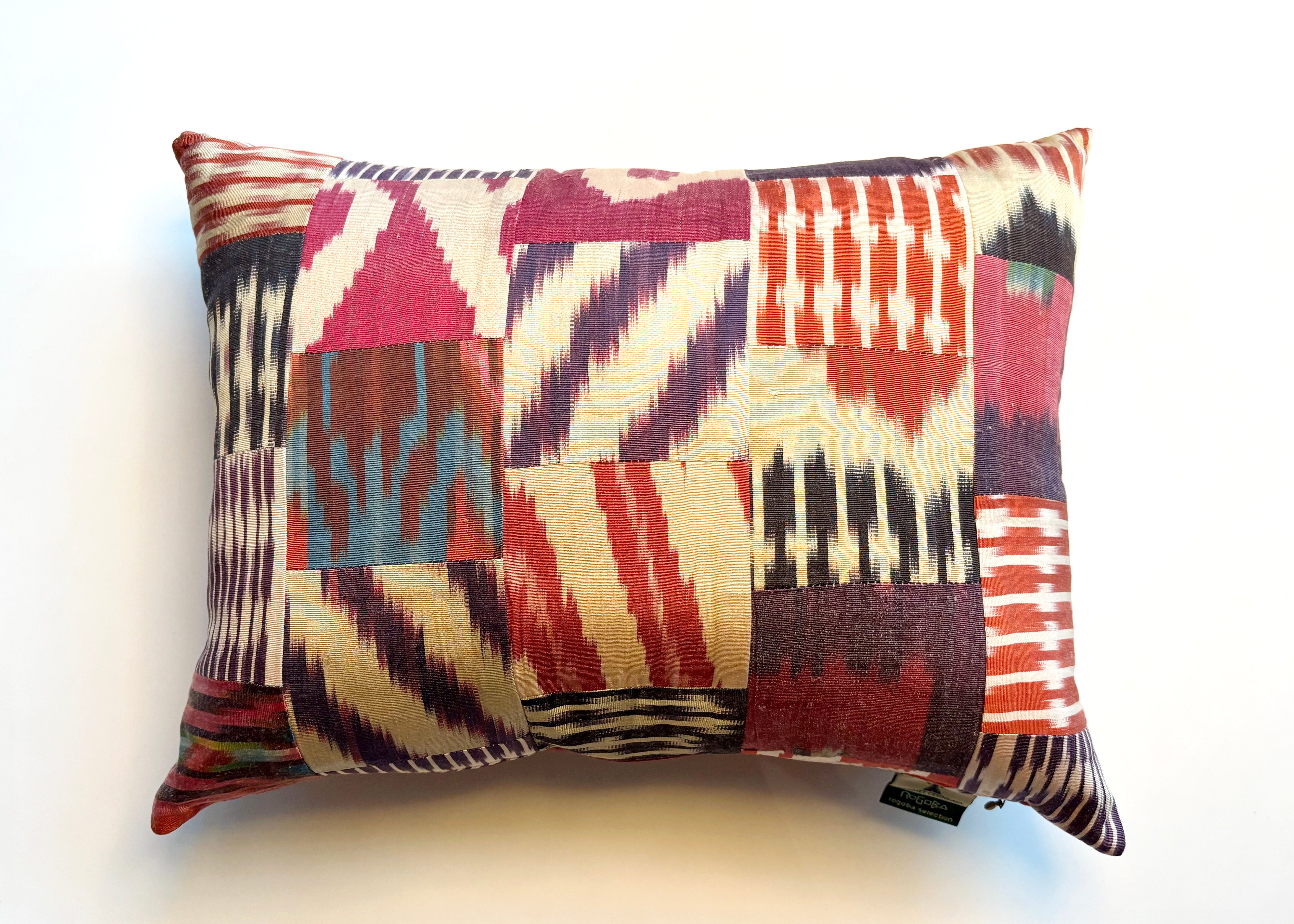 赤色を中心とした華やかな “イカット” (手織りの絹絣) がパッチワークされて作られたクッションです。