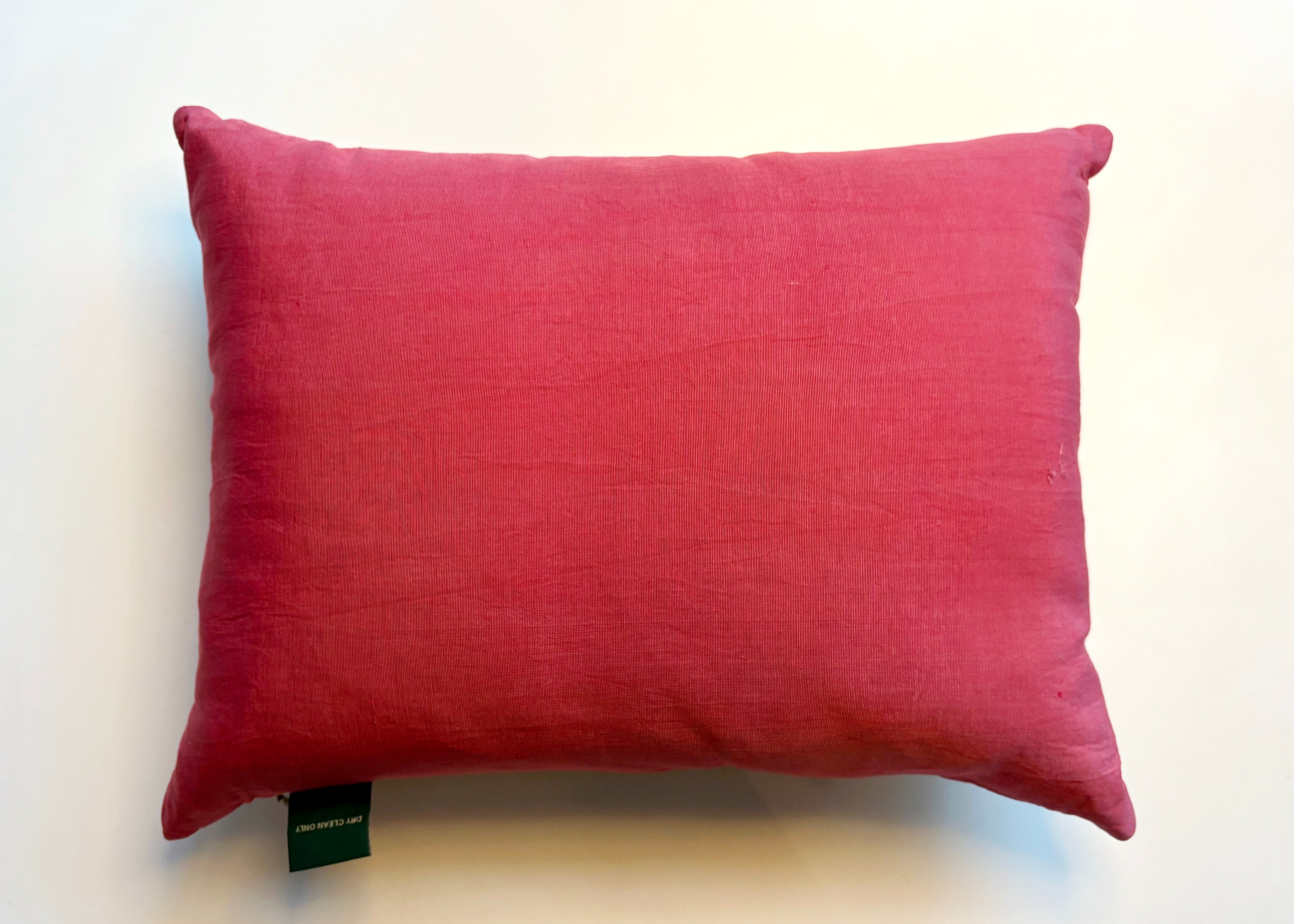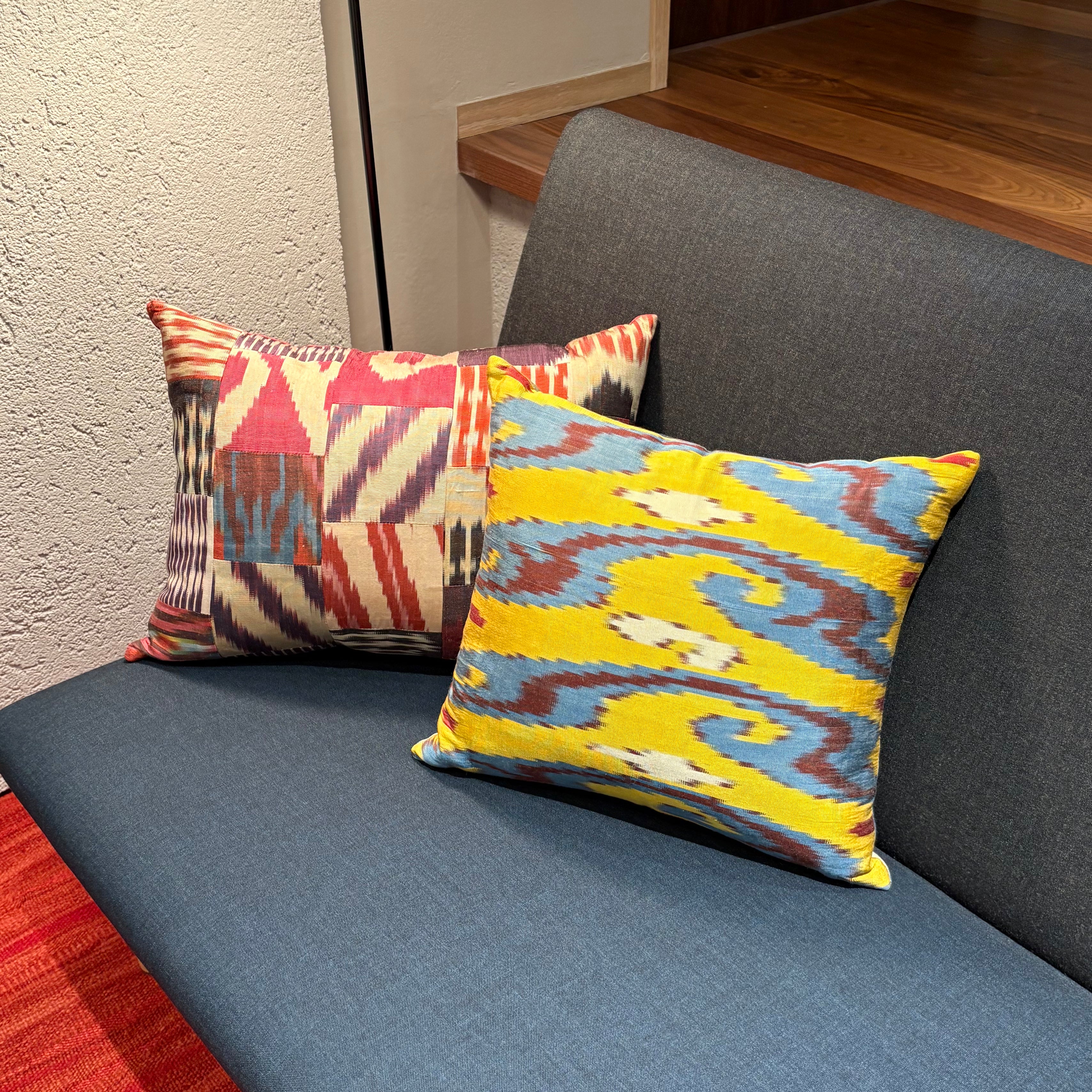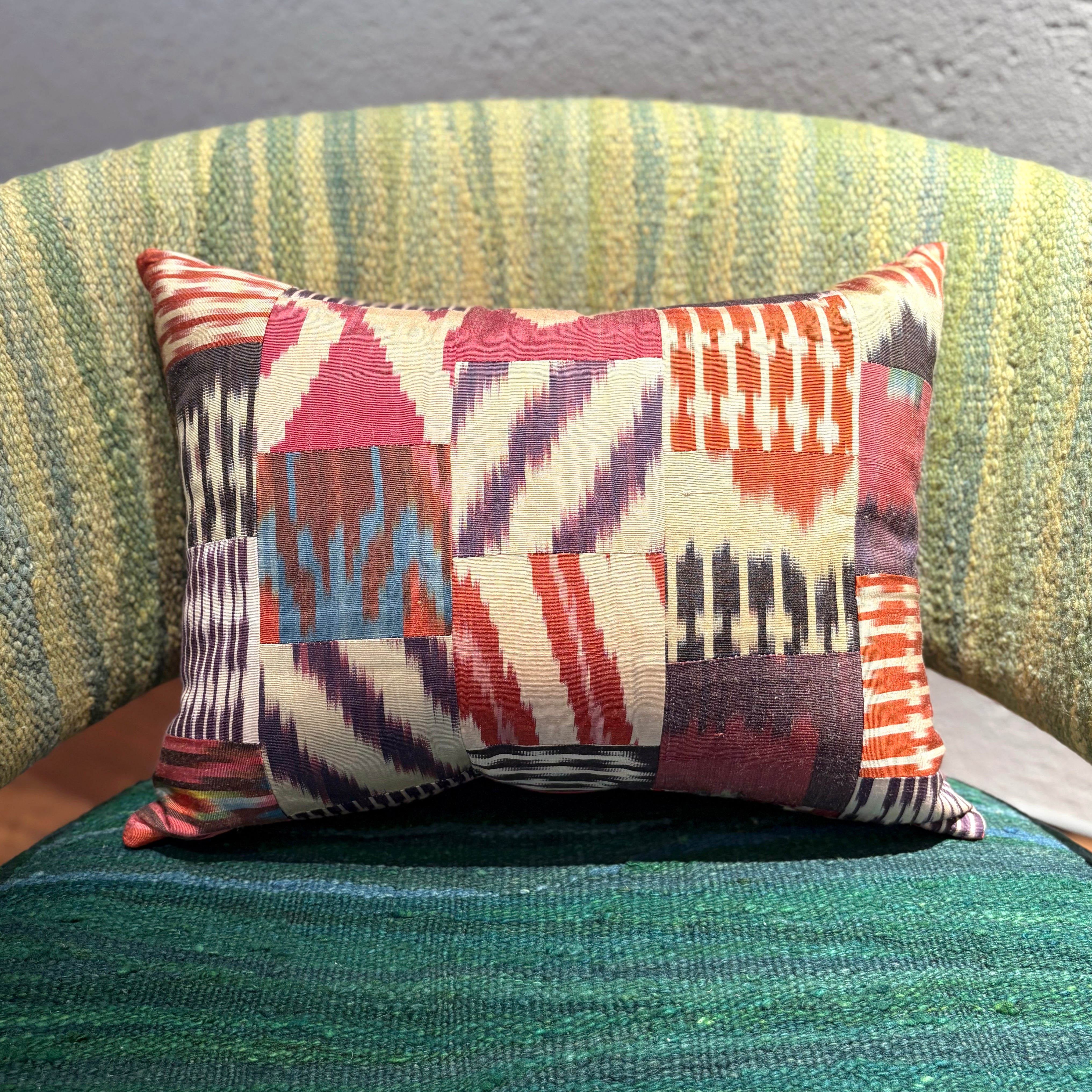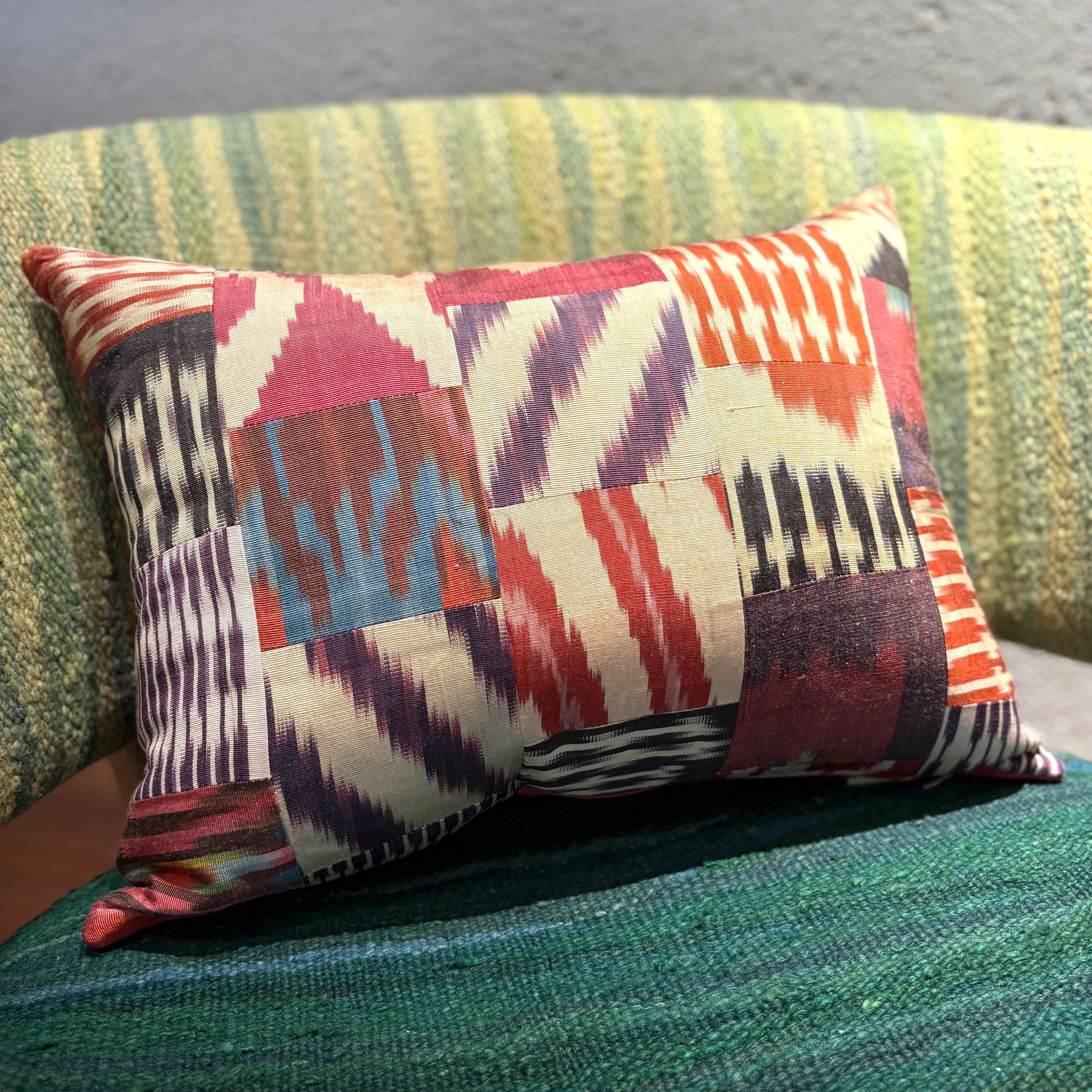 赤色を中心とした華やかな “イカット” (手織りの絹絣) がパッチワークされて作られたクッションです。
