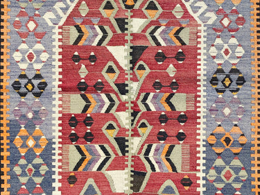 この“エシュメキリム”は、メインの文様が“ミフラーブ文様”で、一人用の礼拝用キリムとして織られたものです。ミフラーブ文様の内部には抽象化された“生命の樹”が描かれています。ここに描かれた生命の樹はとても立派で、周りの狼から家畜(主に羊・牛)を守る無数の文様とともに安全で豊かな生活を心から願っている織り手の気持ちが伝わってきます。