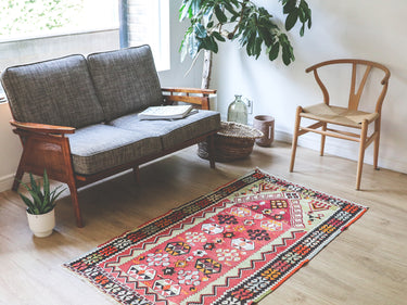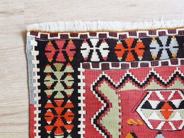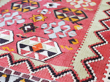 織られた当時は大変色鮮やかで煌びやかであったと想像されるキリムですが、現在は落ち着いた色合いに変化し、可愛い印象を与えています。