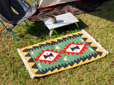 サイズ的には、一人掛けチェアなどと合わせてお使いいただくか、玄関マットや、床に置く絵、壁に掛けるタペストリーなど、インテリアのアクセントとしてお使いいただけます。