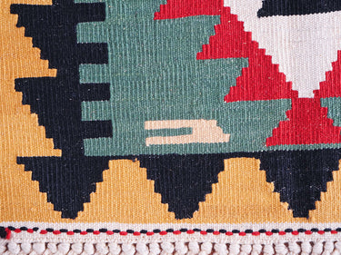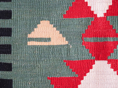 このキリムは、機械紡ぎされたウールを化学染料で染め、手織りされたものです。そのウールは、羊の皮を革に鞣す工程の中で採取し、機械で糸に紡いでいるため、オイル臭が残っている場合もございます。