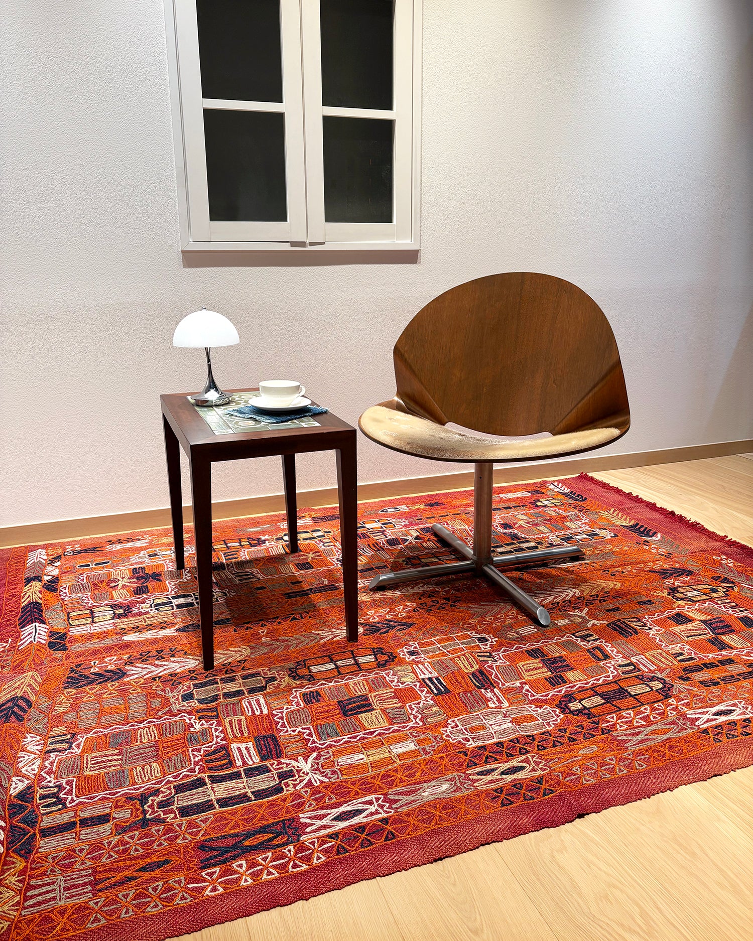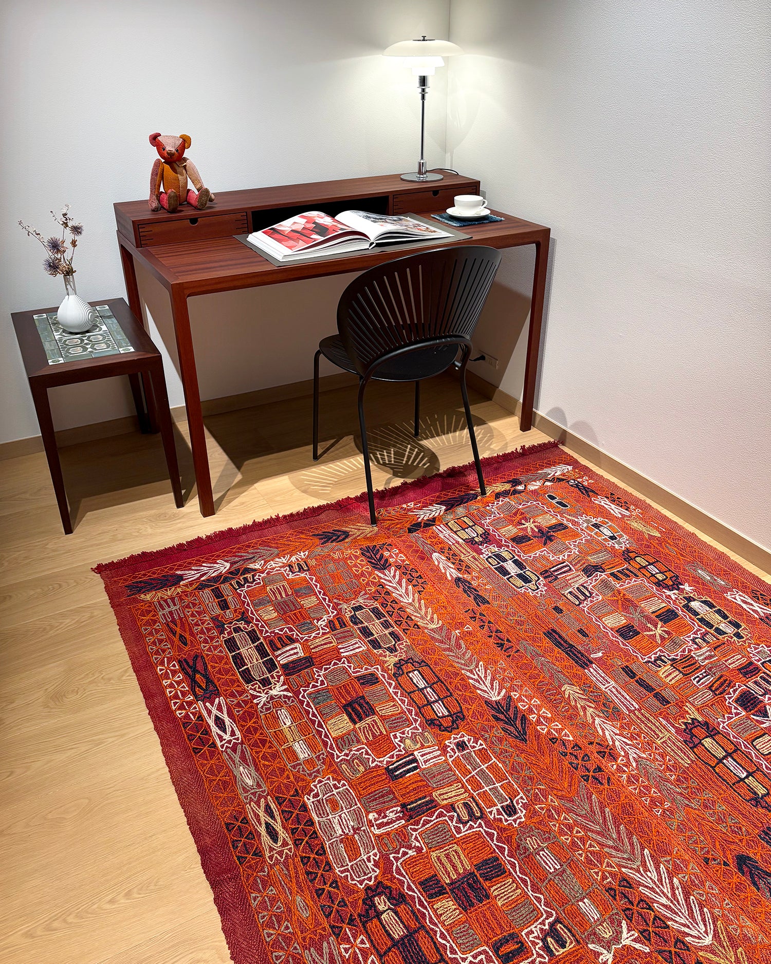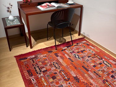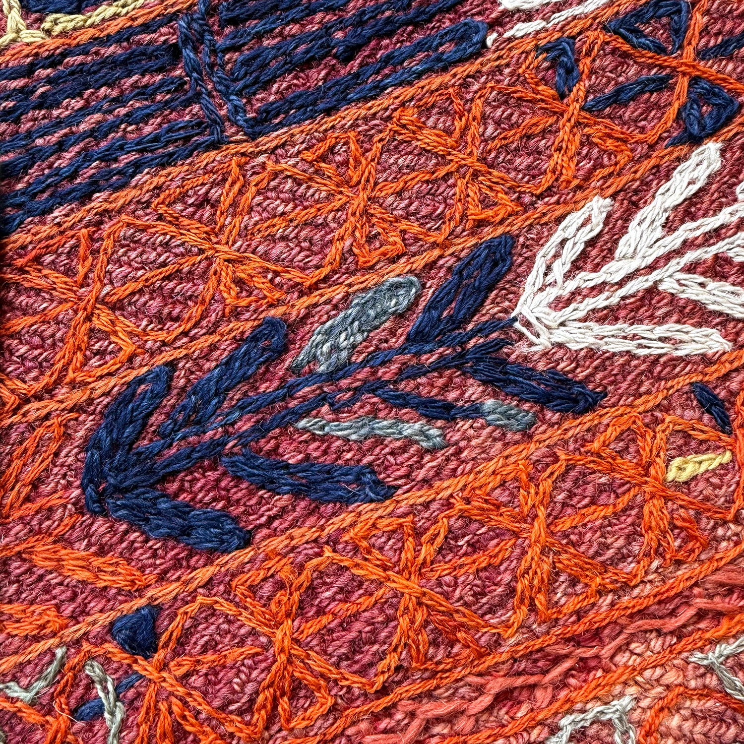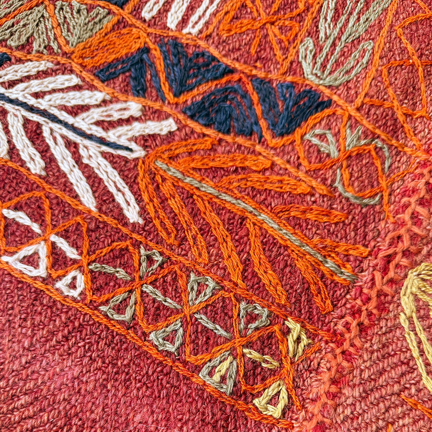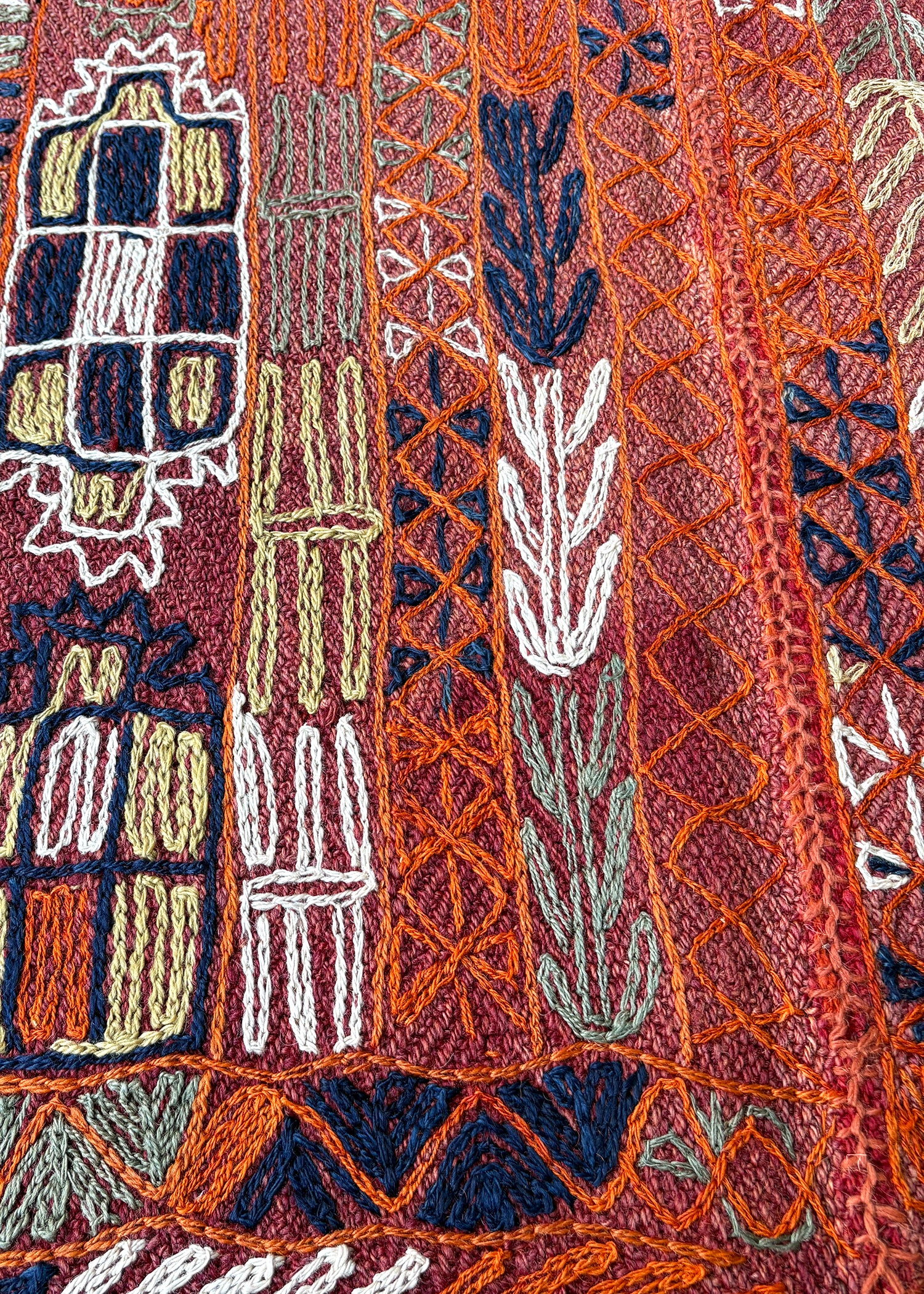 こちらのエレーシは、深い赤の織り地に、白や紺、オレンジ色などの糸で刺繍が施されているのが特徴です。子どもが一生懸命お絵描きをしたような、無邪気な可愛らしさがあります。