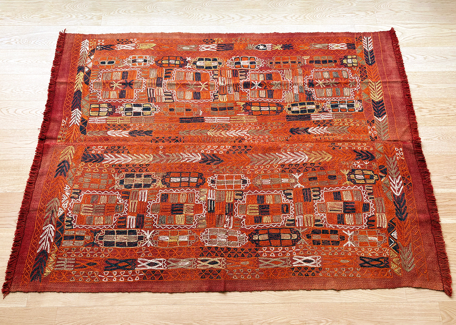 湿原での暮らしに身近な花、人、鳥、魚、ラクダなどがチェーンステッチ(鎖縫い)によって描かれています。その輪郭や並び方はとても有機的で、手仕事ゆえの温もりが感じられます。