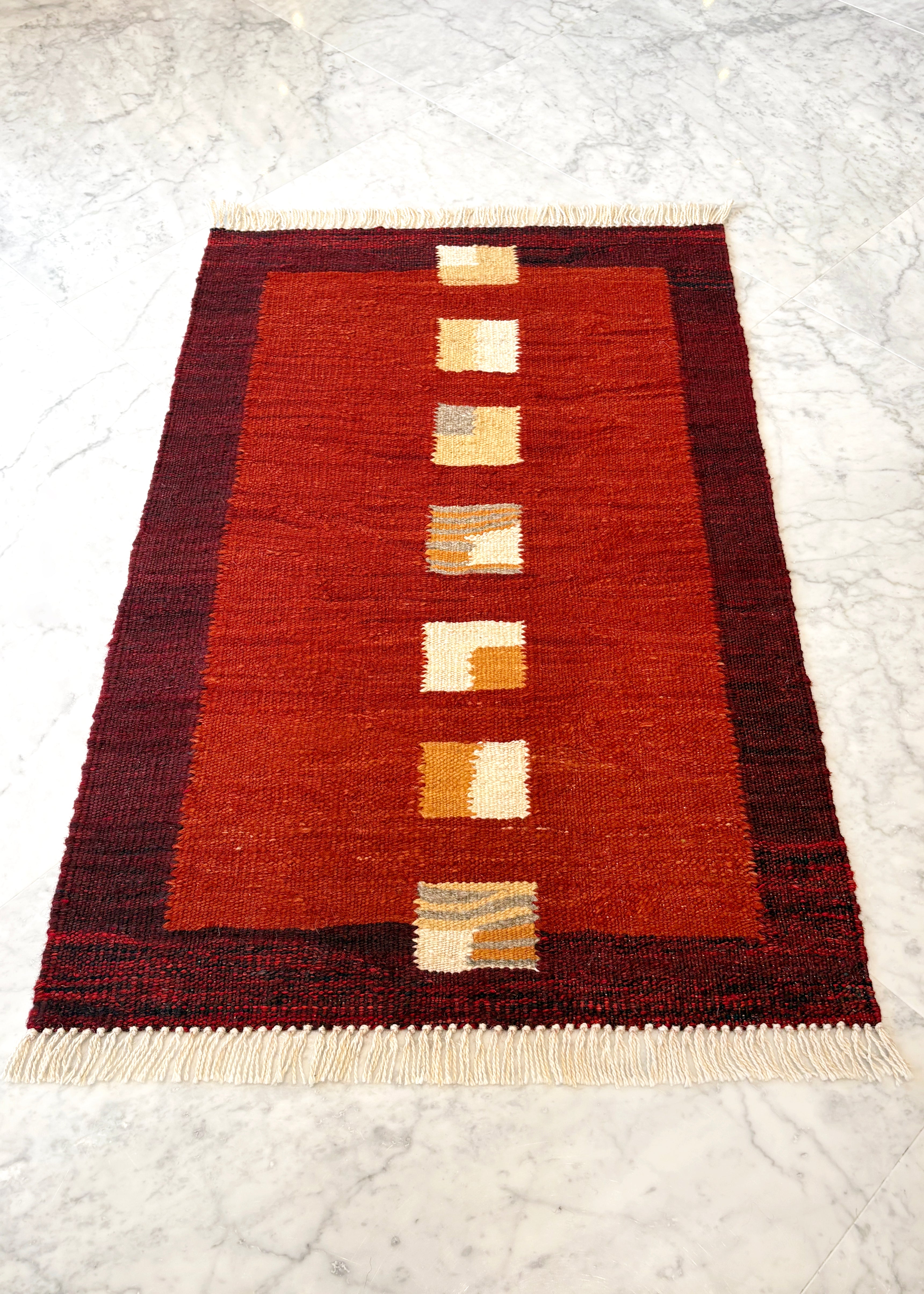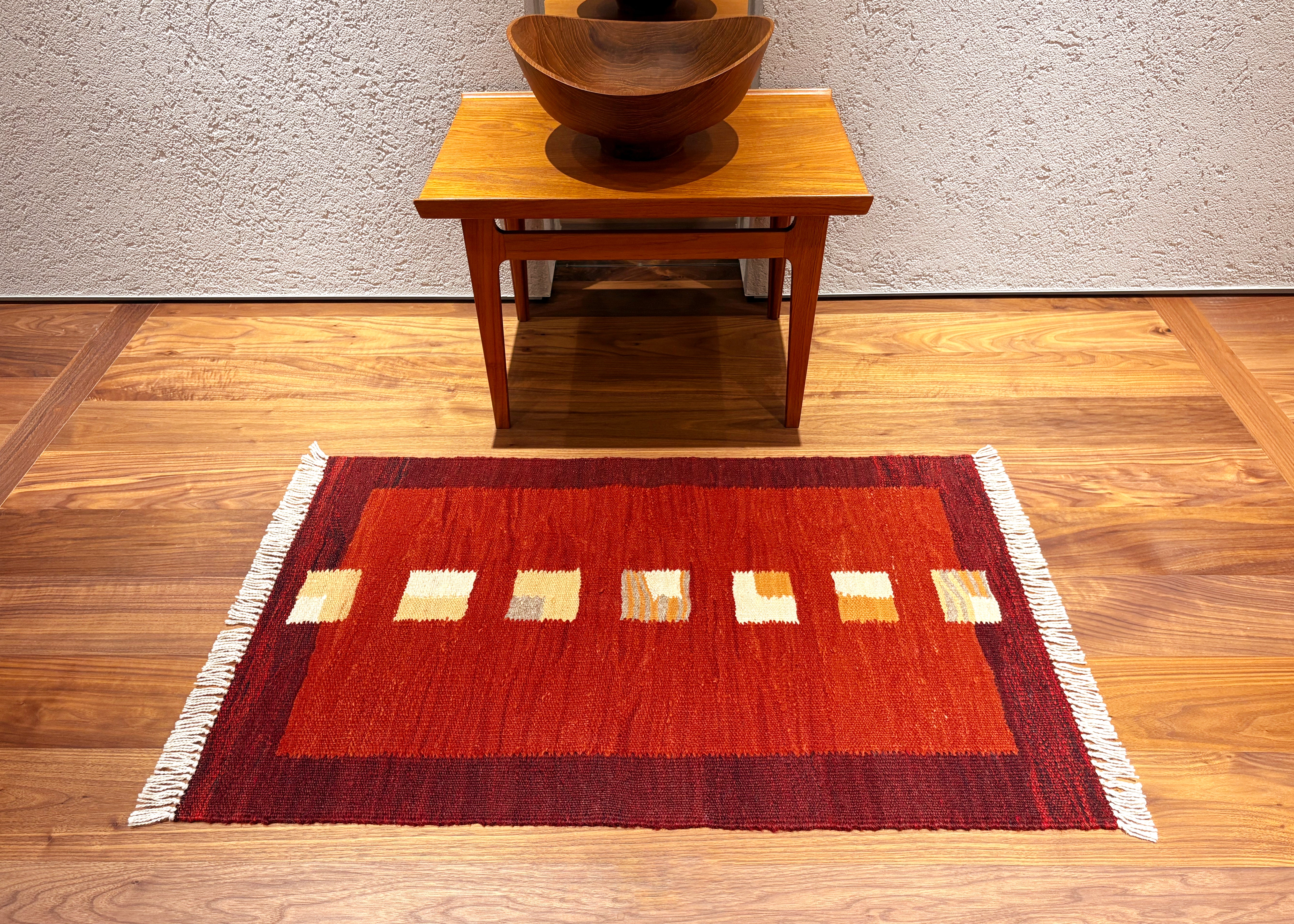 羊の文様の部分に黄色が使われ織られた、小さめサイズの可愛らしいキリムです。