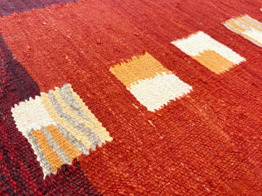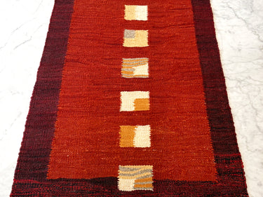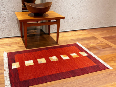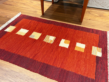 このキリムの文様・デザインは、たくさんの羊が豊かな草原で餌を喰んでいる様子を表しています。四周の赤枠はその中が安全であることを示すお守り(柵)であり、方形の一つ一つは守られた羊を表しています。今尚羊を家族のように飼い育てている織り手たちが、田舎の自然溢れる生活の中で、資産である家畜が増えてくれることを願い生み出した21世紀のモダンキリムです。